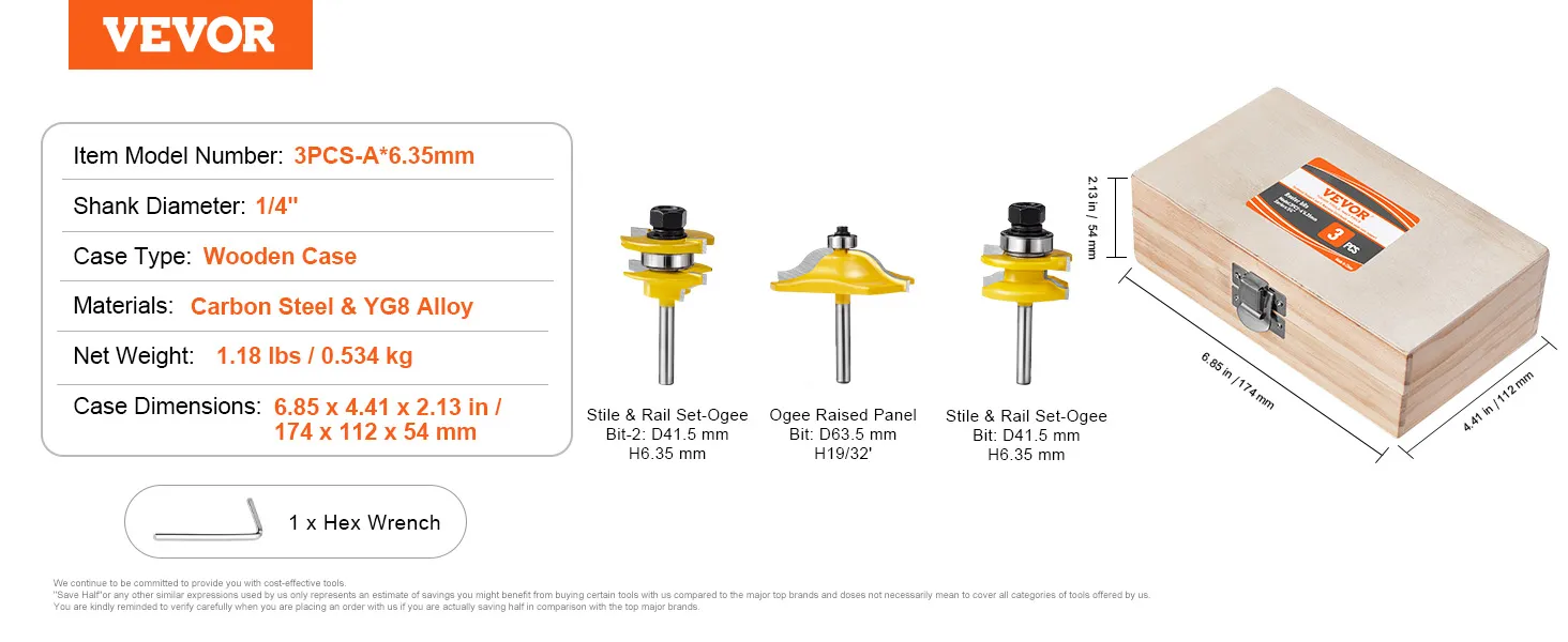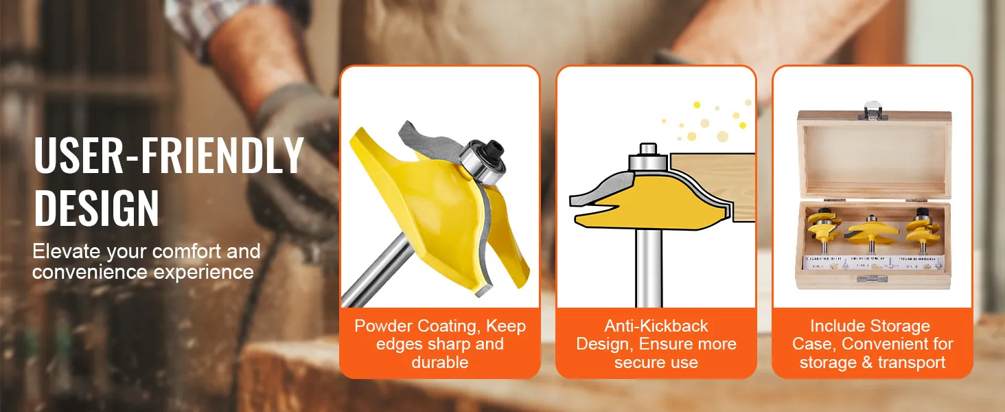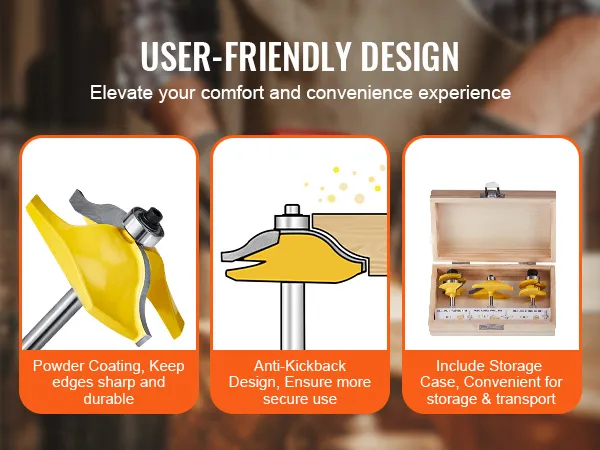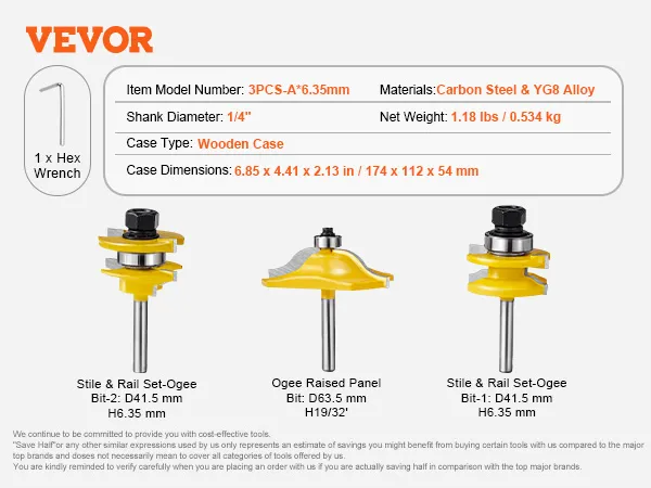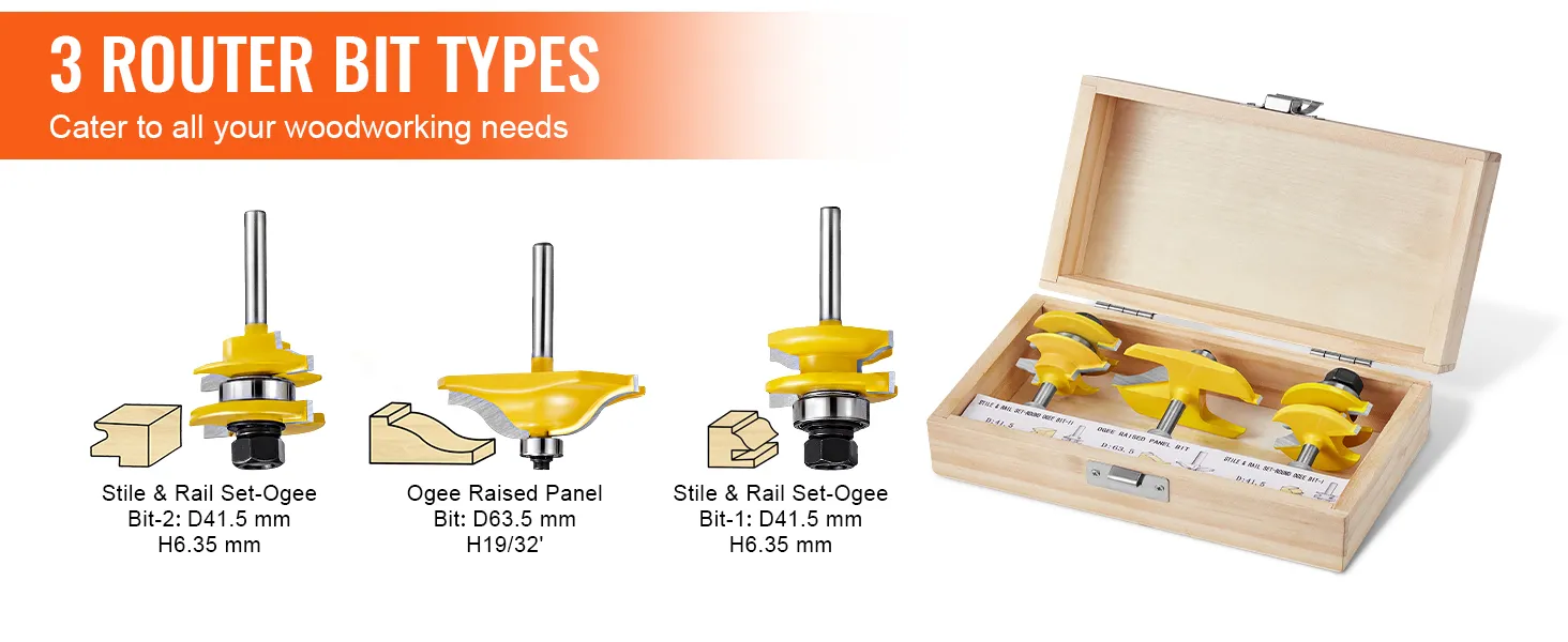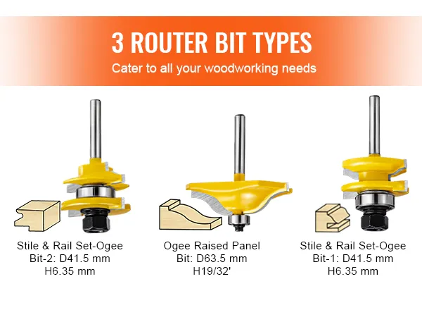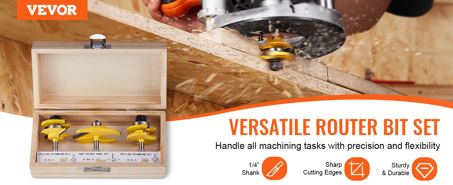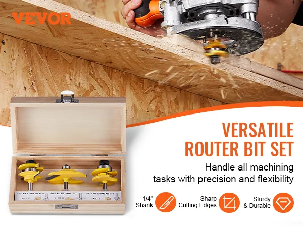 Brede toepassing: deze set bevat 3 verschillende freesbits, waardoor hij ideaal is voor het snijden, trimmen, groefsteken en textureren van al uw houtbewerkingsprojecten. Geschikt voor gebruik op hout, vezelplaat van gemiddelde dichtheid (MDF), spaanplaat, multiplex en compact karton, het is een veelzijdige aanvulling op elke werkplaats.