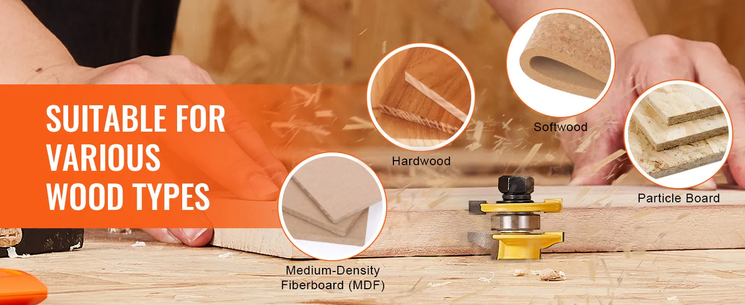 Onze freesset is ideaal voor gebruik op hout, vezelplaat met gemiddelde dichtheid (MDF), spaanplaat, multiplex en compacte platen. (Let op: niet geschikt voor het zagen van ferrometalen of andere materialen dan hout, zoals staal, ijzer of zand.)