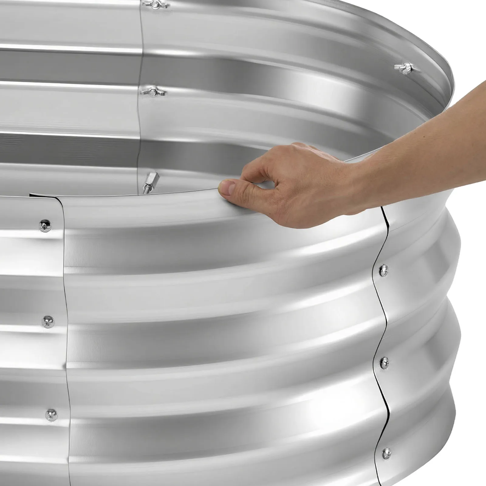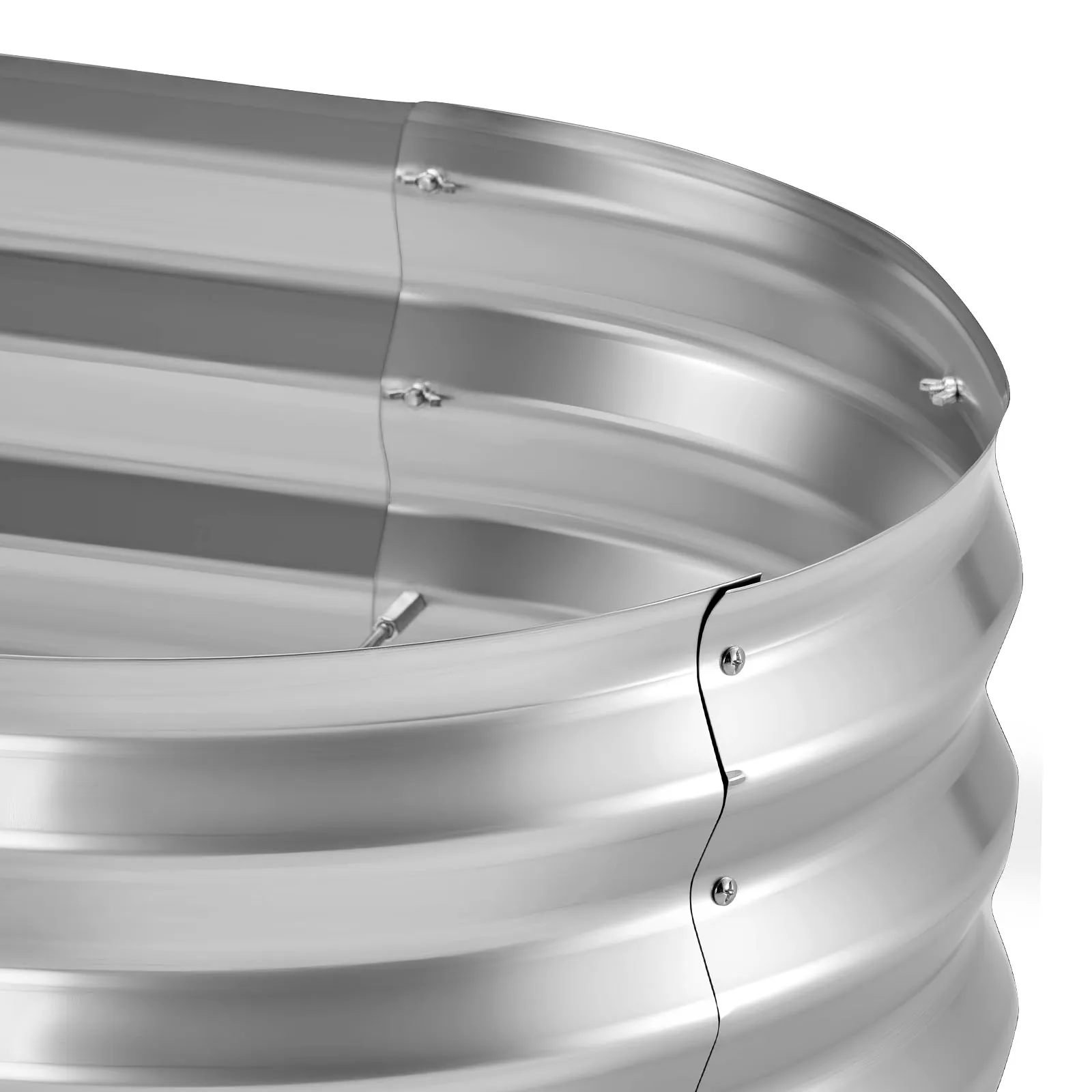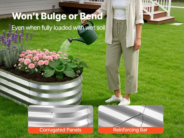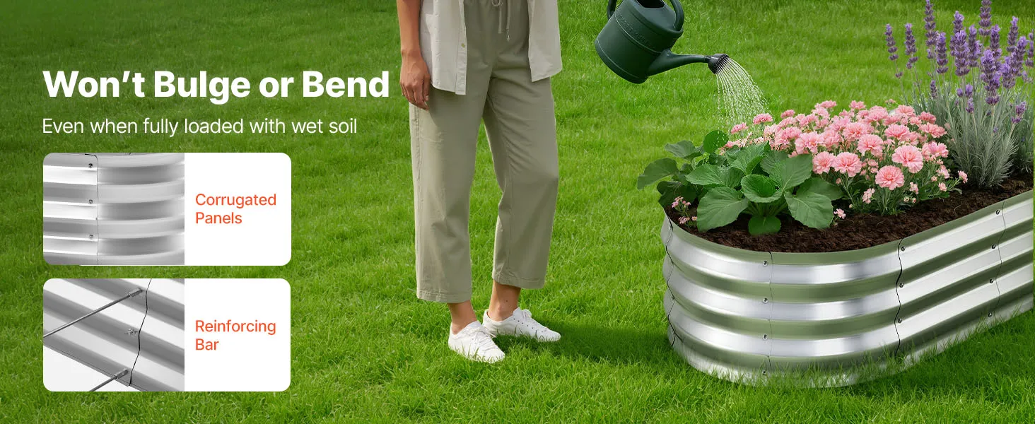 Verstevigde en stabiele constructie: Deze tuinbak is voorzien van gegolfde metalen panelen die de gronddruk gelijkmatig verdelen. Verstevigingsstaven voorkomen uitstulpingen of vervorming, zelfs wanneer de bak volledig gevuld is met natte grond – ideaal voor langdurig gebruik.