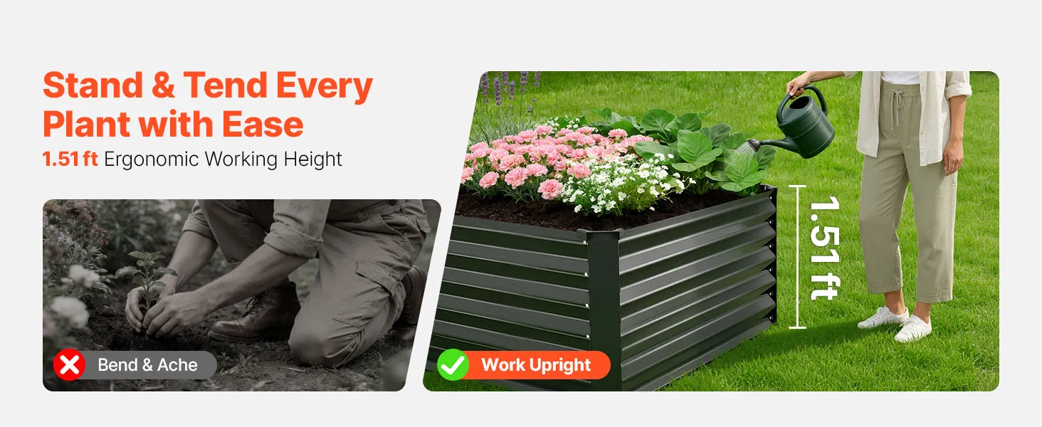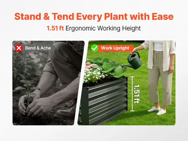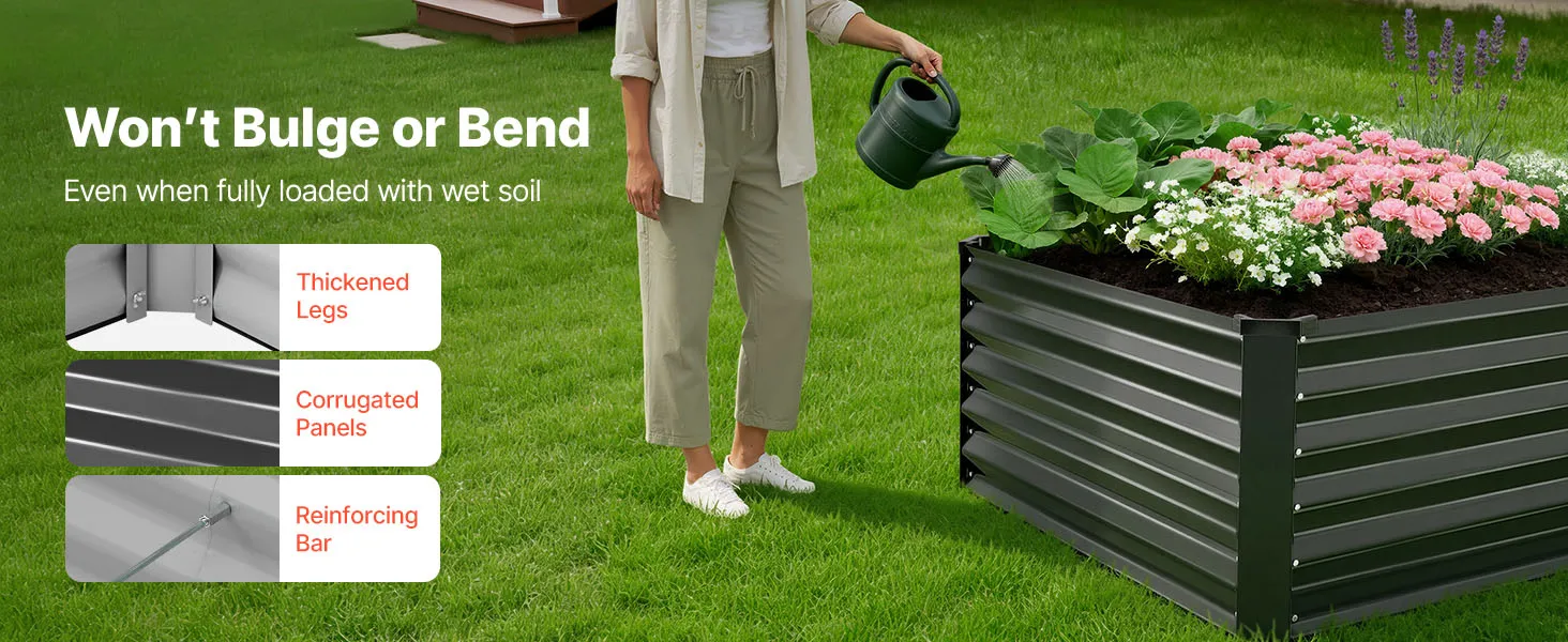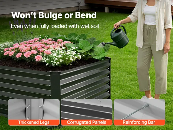 Verstevigde en stabiele constructie: Dankzij verdikte poten, gegolfde panelen en verstevigingsstangen verdeelt dit tuinbed de gronddruk gelijkmatig. Het is ontworpen om kromtrekken te voorkomen en stabiel te blijven, zelfs wanneer het na het water geven volledig gevuld is met natte grond.