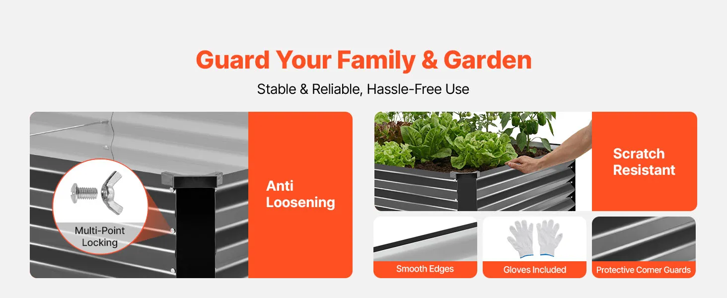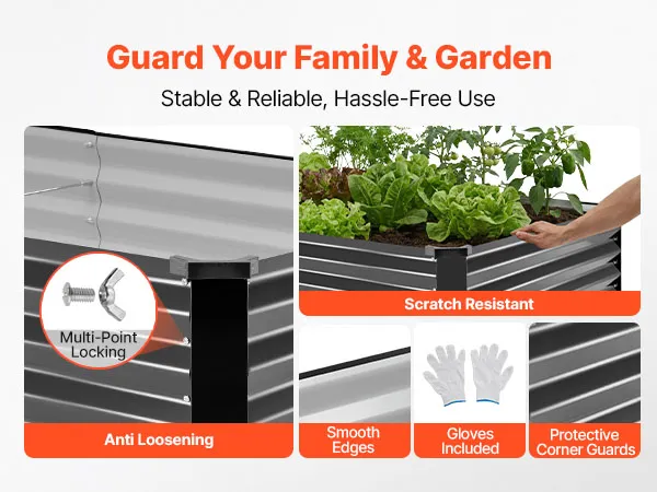 Veilig tuinieren: Dankzij meerdere verbindingspunten en een stevig frame kan deze moestuinbak stevig en veilig worden gemonteerd. Afgeronde randen, hoekbeschermers en de meegeleverde handschoenen verminderen het risico op letsel en zorgen voor veilig tuinieren.