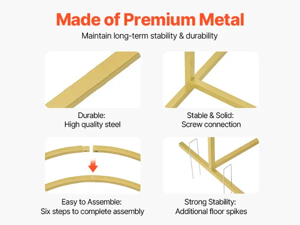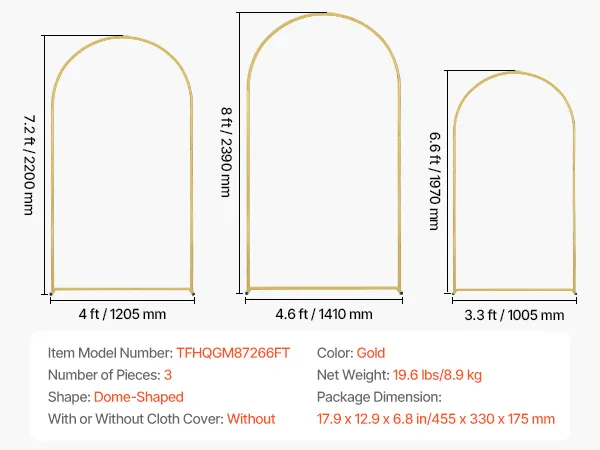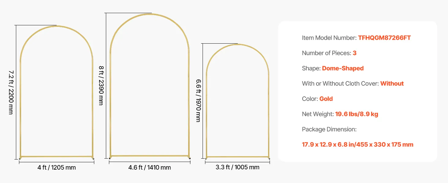 This 3-piece gold wedding arch backdrop stand, measuring 8 x 4.6 ft, 7.2 x 4 and 6.6 x 3.3 ft, adds romance and elegance to weddings, It becomes a photo-worthy focal point for guests. The upgraded 18 x 18 mm durable metal frame ensures stability and durability.