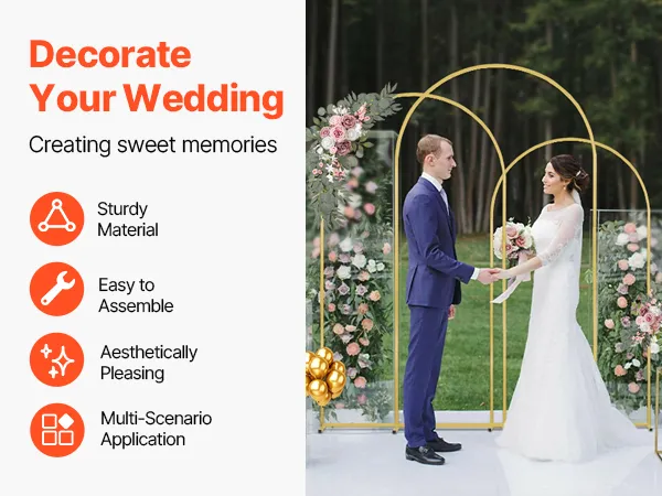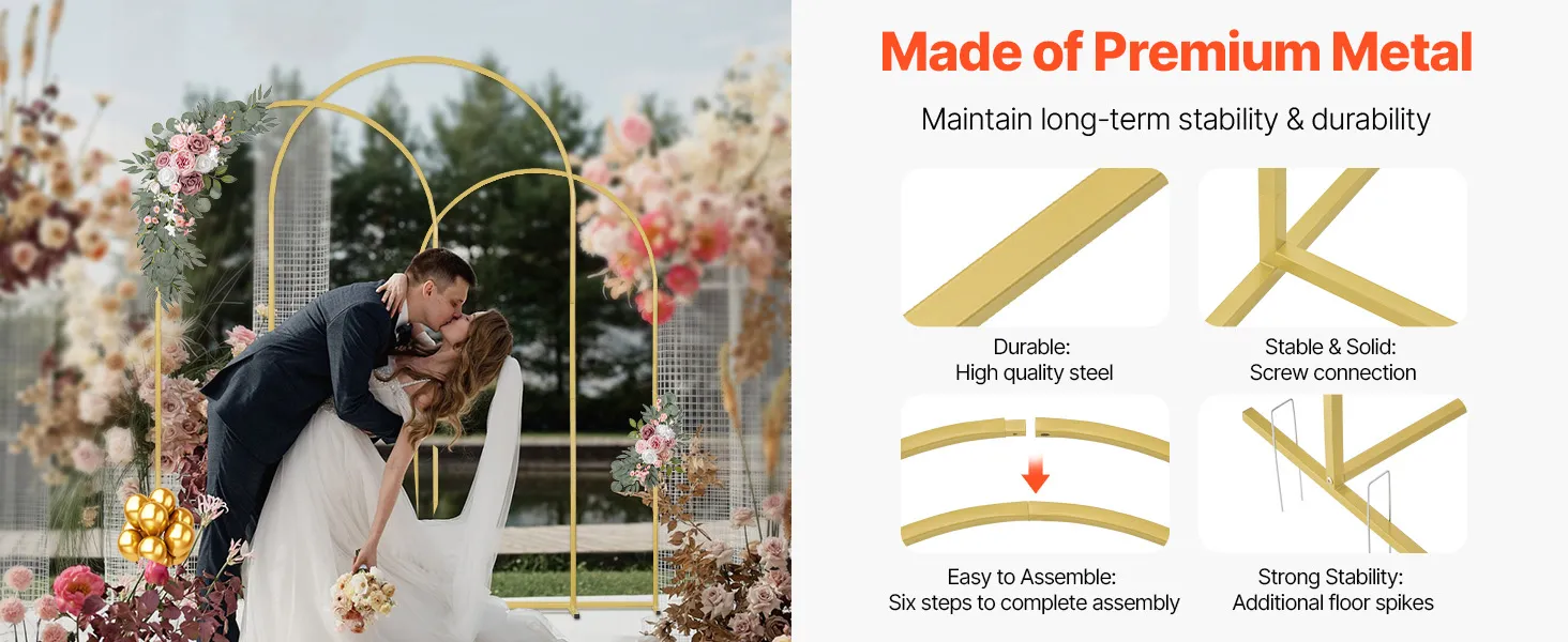 Elegant Design: This wedding arch backdrop stand includes 3 gold arch frames in sizes 8 x 4.6 ft, 7.2 x 4 and 6.6 x 3.3 ft, creating a romantic and elegant atmosphere for weddings while serving as a popular backdrop for guest photos.