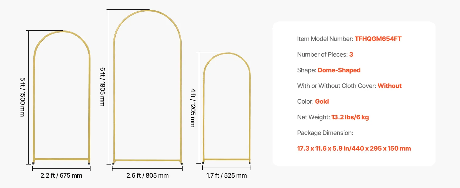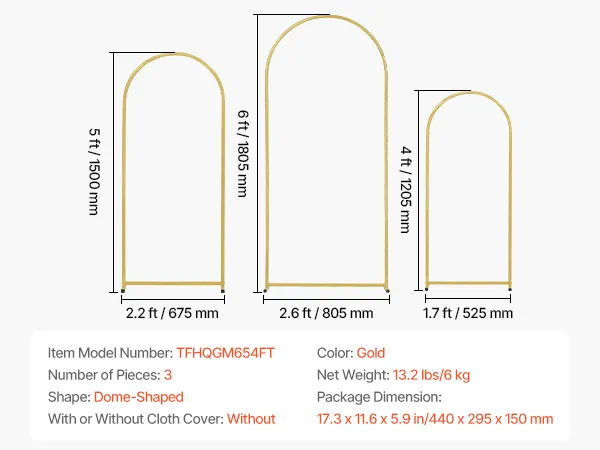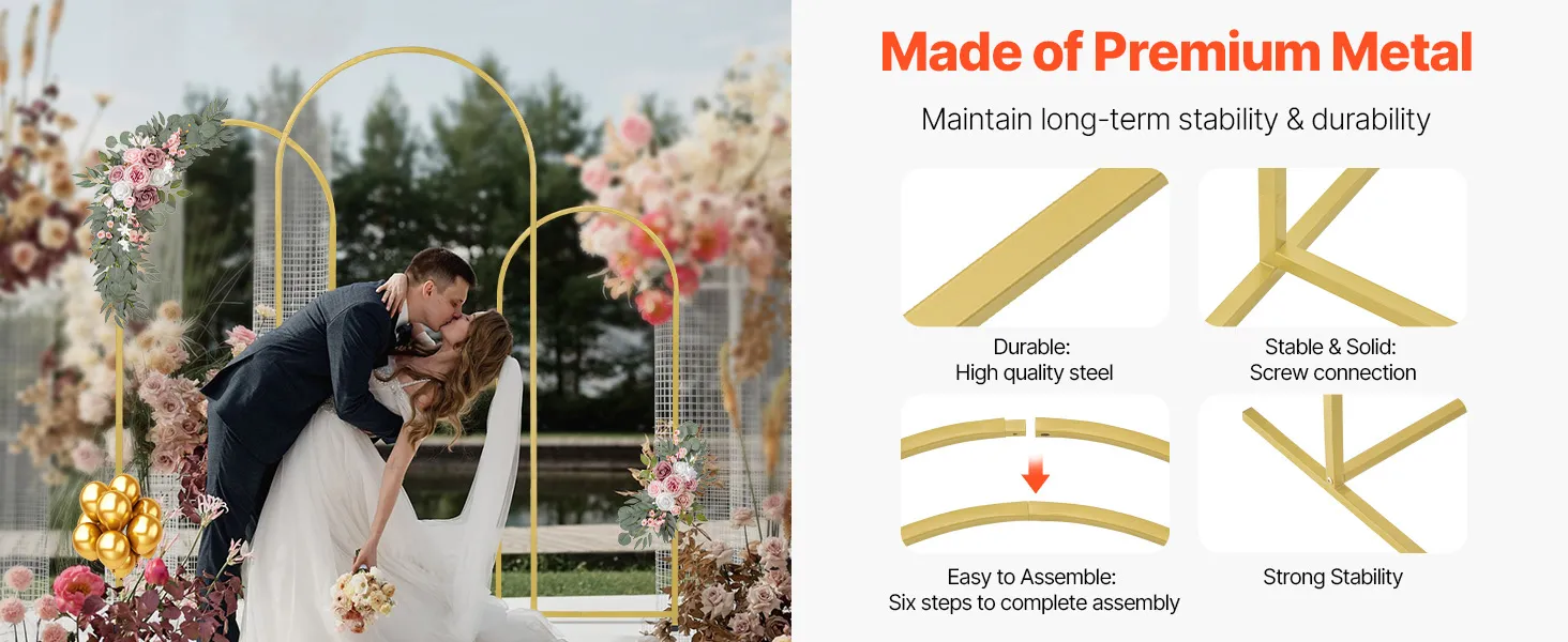 Elegant Design: This wedding arch backdrop stand includes 3 gold arch frames in sizes 6 x 2.6 ft, 5 x 2.2 and 4 x 1.7 ft, creating a romantic and elegant atmosphere for weddings while serving as a popular backdrop for guest photos.