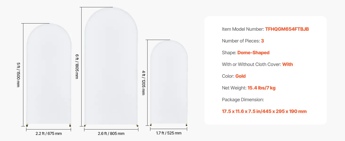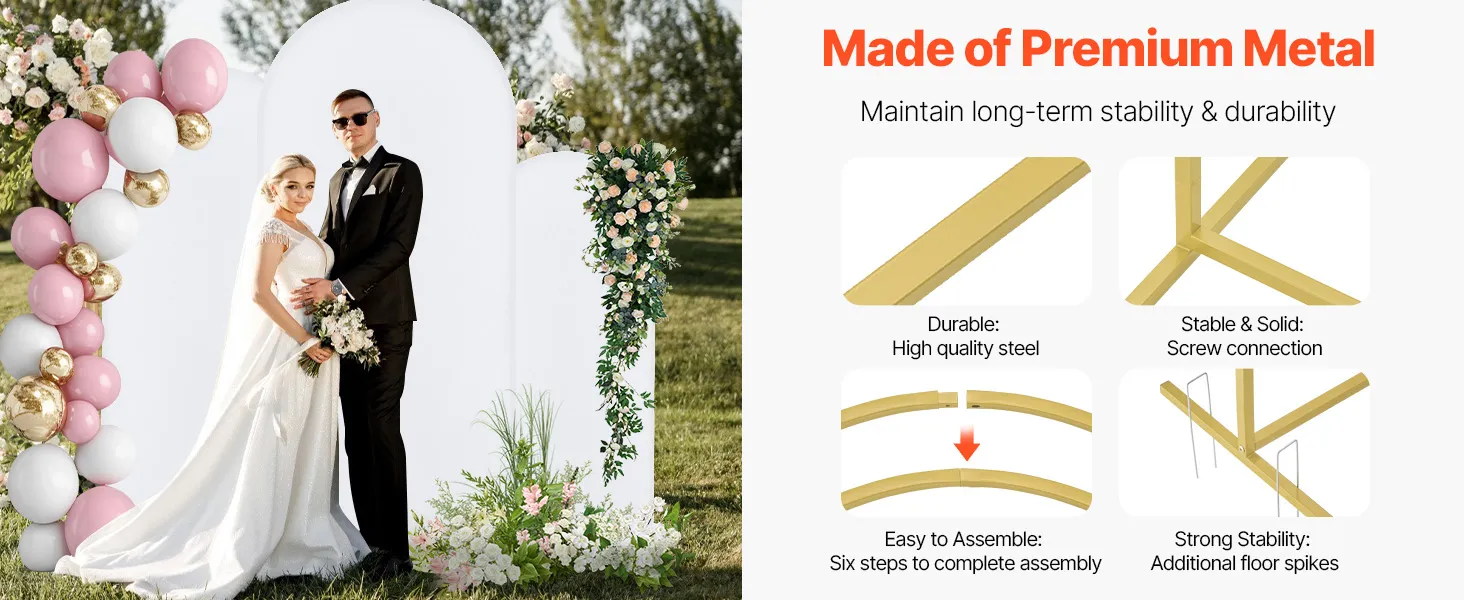 Elegant Design: This wedding arch backdrop stand includes 3 gold arch frames in sizes 6 x 2.6 ft, 5 x 2.2 and 4 x 1.7 ft, creating a romantic and elegant atmosphere for weddings while serving as a popular backdrop for guest photos.