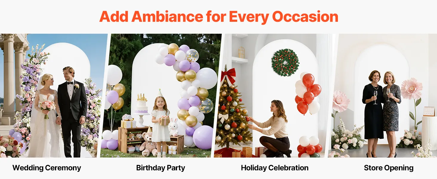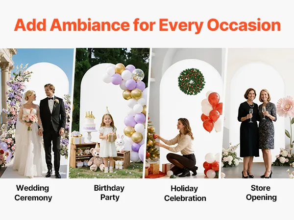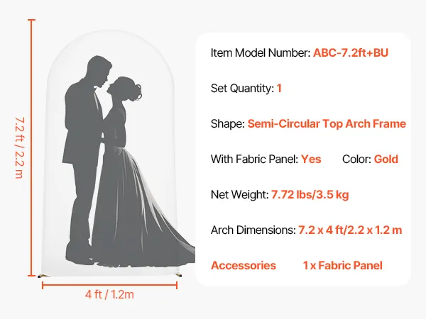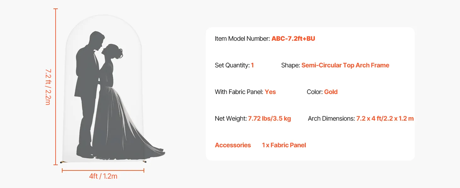 Elegant ontwerp: Deze boogvormige achtergrondstandaard uit één stuk, met afmetingen van 2,2 x 1,2 m (7,2 x 4 ft), is geschikt voor zowel binnen- als buitengebruik. Hij versterkt de visuele impact en creëert een unieke, romantische sfeer voor elk feest.