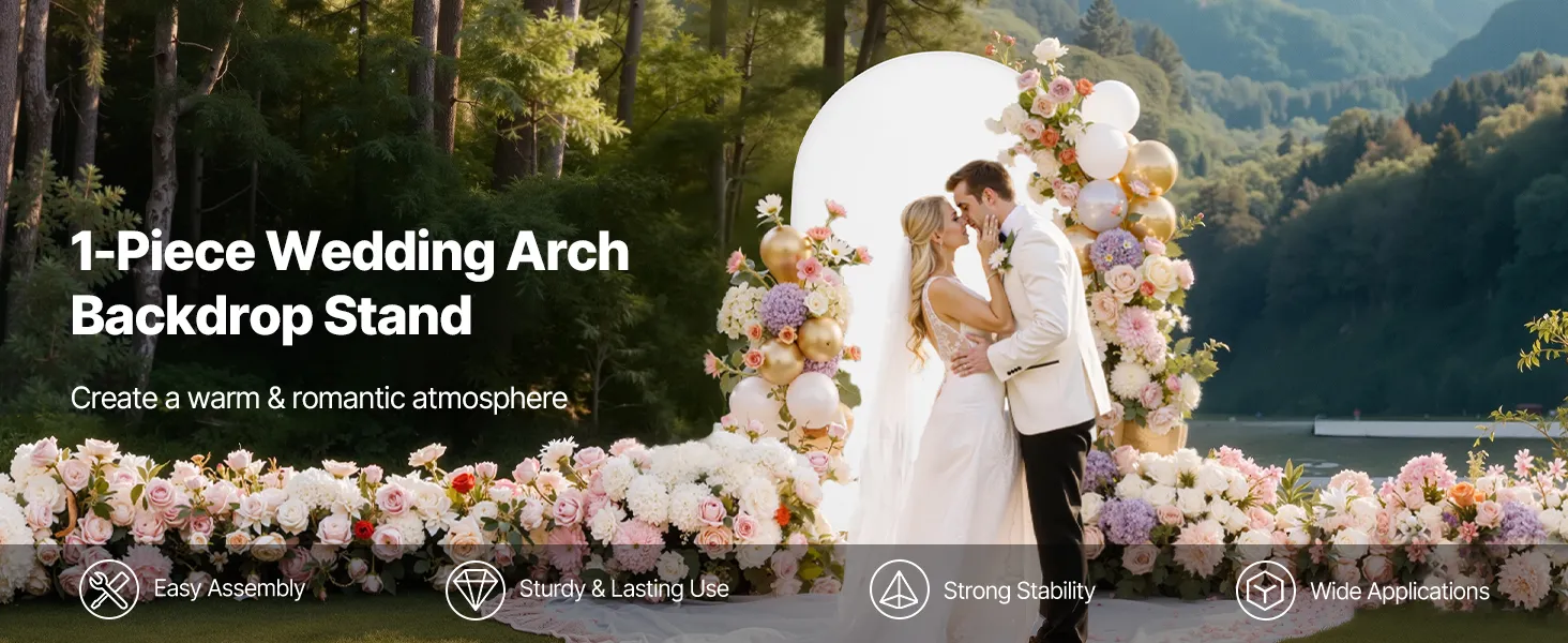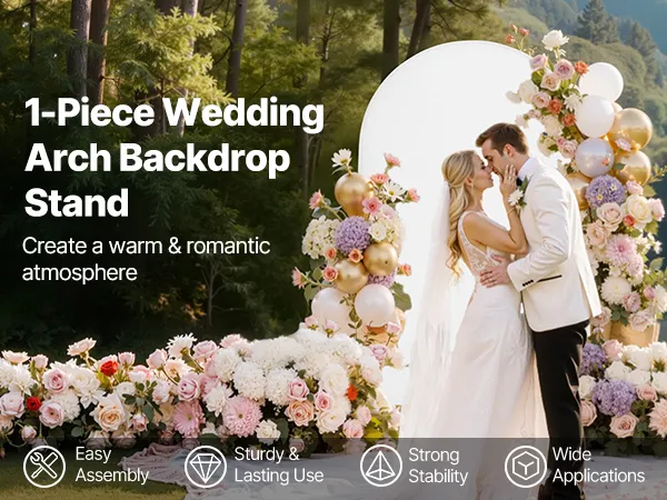 Deze boogvormige achtergrondstandaard uit één stuk is eenvoudig te monteren. Dankzij het metalen frame is hij stabiel en duurzaam. Hij is ideaal voor binnen- en buitenevenementen en draagt moeiteloos bij aan een warme en romantische sfeer.