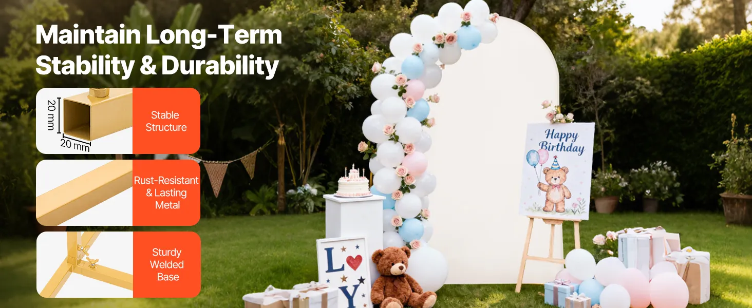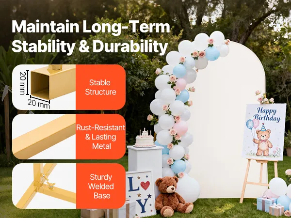 Stabiele ondersteuning: Deze metalen achtergrondstandaard met boog heeft een verstevigde, gelaste basis. Dit verhoogt de stabiliteit, zorgt voor een stevige houvast en vermindert wiebelen, zodat uw decoraties veilig op hun plaats blijven.