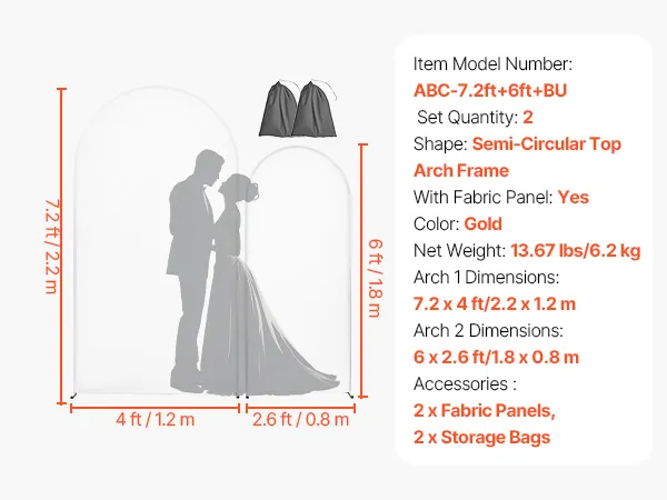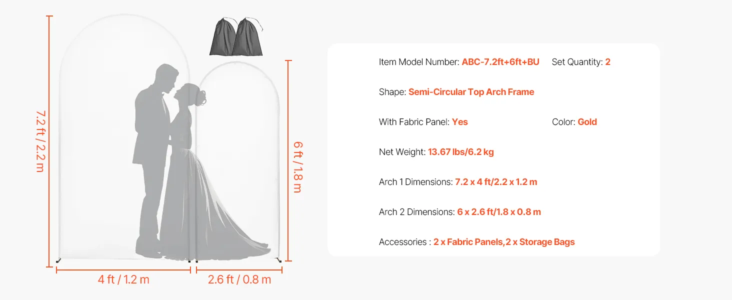 VEVOR Trouwboog, Set van 2 (2,2 m & 1,8 m), Achtergrondstandaard, Goudkleurige metalen boog, Trouwboog, Ballonnenboog met Hoes voor Bruiloften, Verjaardagsfeesten, Festivals & Ceremonies