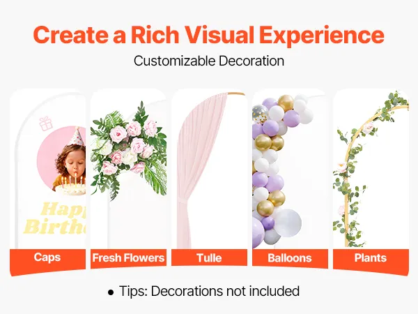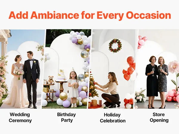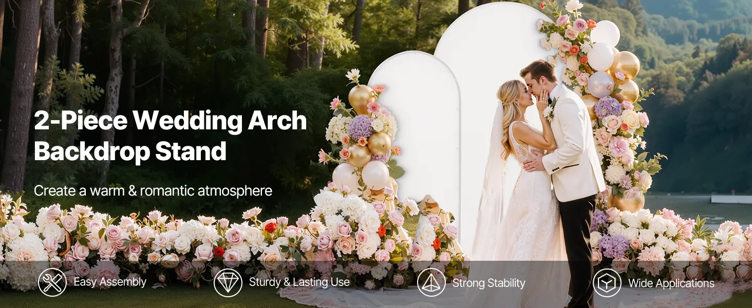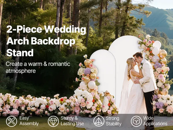 Dit tweedelige boogvormige achtergrondsysteem is eenvoudig te monteren. Dankzij het metalen frame is het stabiel en duurzaam. Het is ideaal voor binnen- en buitenevenementen en draagt moeiteloos bij aan een warme en romantische sfeer.