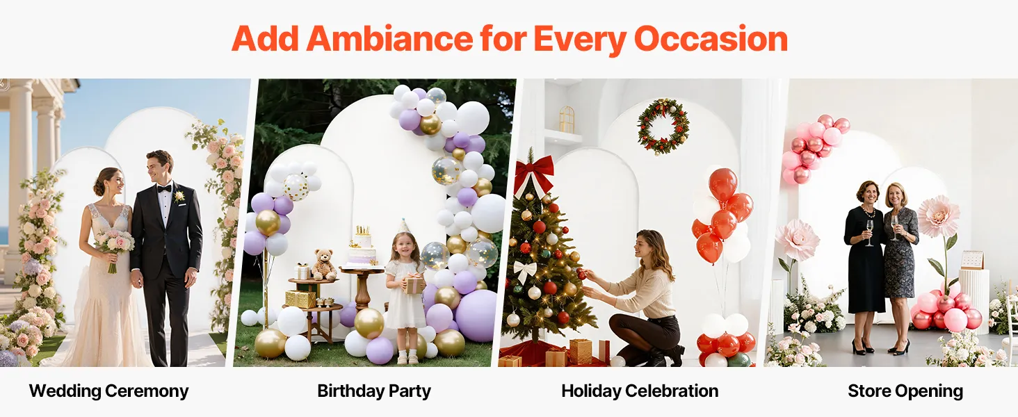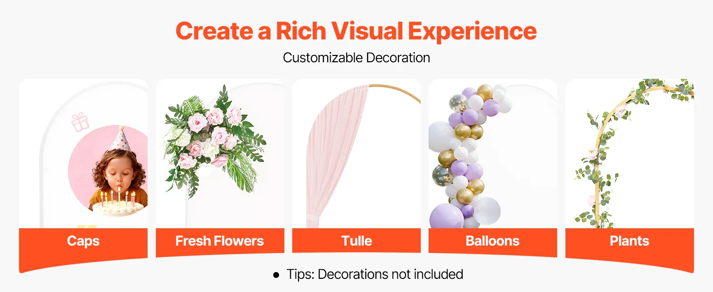Veelzijdig gebruik: De metalen boogstandaard is ideaal voor bruiloften, feesten, vieringen of openingsdecoraties en kan worden versierd met ballonnen, bloemen, tule, enz. (LET OP: Opbergtassen en stoffen panelen zijn inbegrepen; decoraties zijn niet inbegrepen).