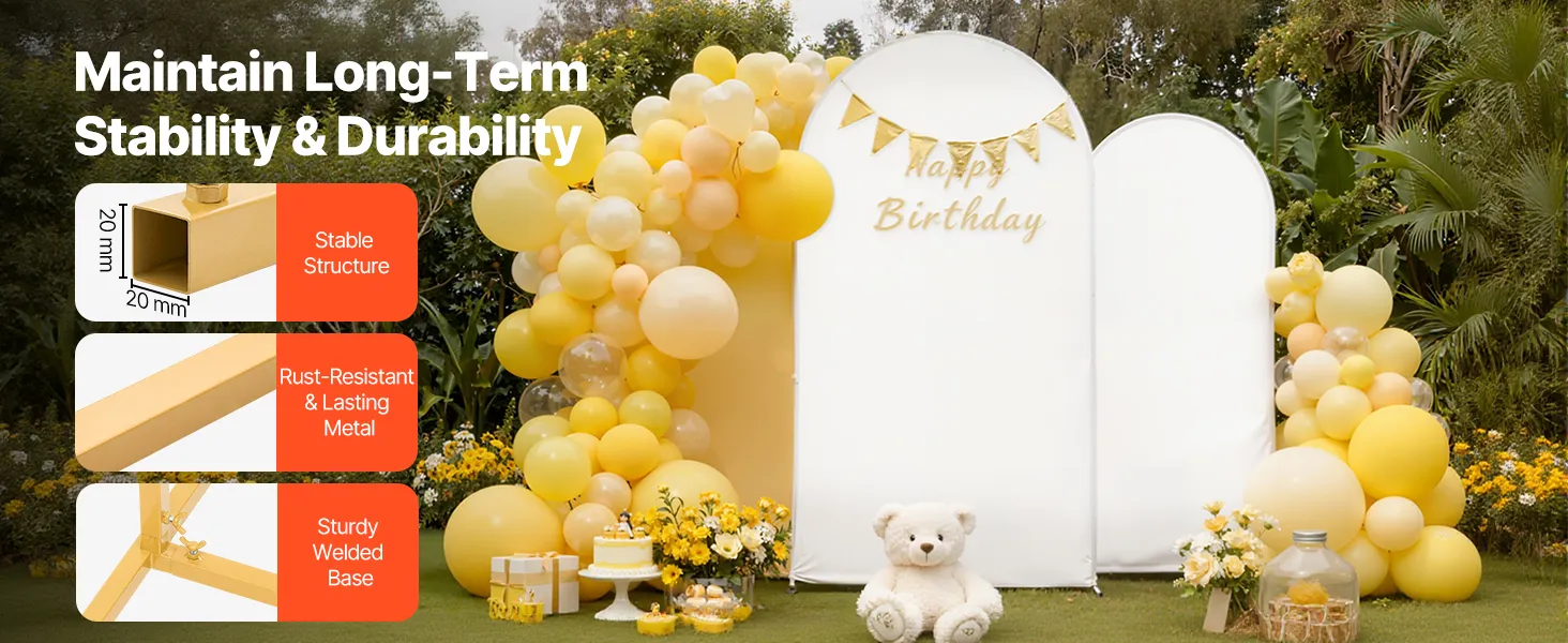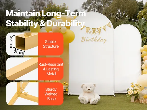 Stabiele ondersteuning: Deze metalen achtergrondstandaard met boog heeft een verstevigde, gelaste basis. Dit verhoogt de stabiliteit, zorgt voor een stevige houvast en vermindert wiebelen, zodat uw decoraties veilig op hun plaats blijven.