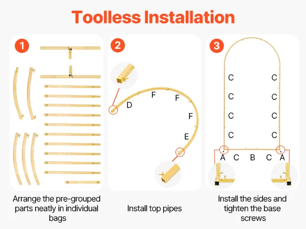 Deze achtergrond met gouden bogen kan zonder gereedschap in elkaar worden gezet. De afzonderlijke onderdelen zijn apart verpakt en gebundeld om de montage te vereenvoudigen.