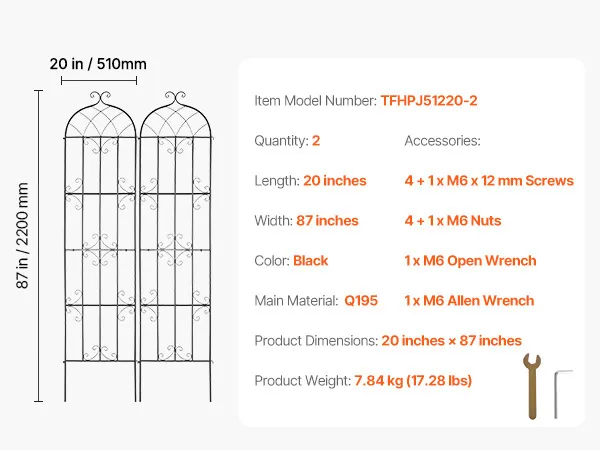 VEVOR Garden Trellis for Climbing Plants, 87 x 20 in, 2 Packs Rustproof Metal Garden Flower Trellis, Outdoor Climbing Rose Trellis Cucumbers Support, Decorative Clematis Trellis for Courtyards Lawns