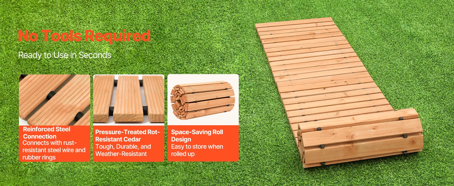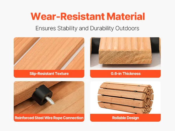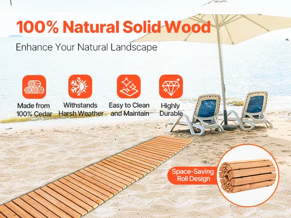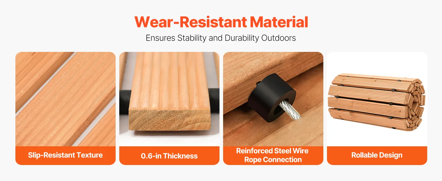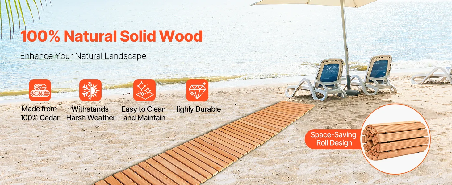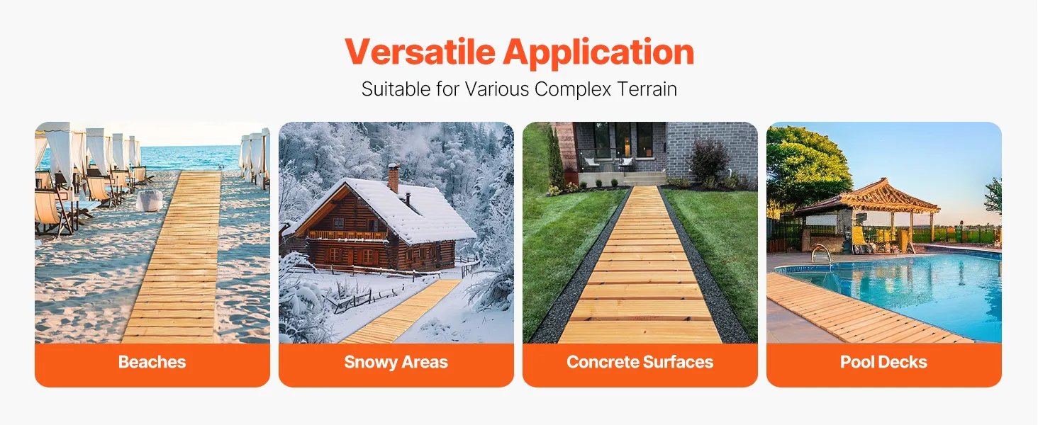 Versatile Usage: Suitable for various surfaces, this roll out wooden walkway is perfect for gardens, patios, beaches, and more, making it ideal for outdoor events like parties, weddings, and camping.