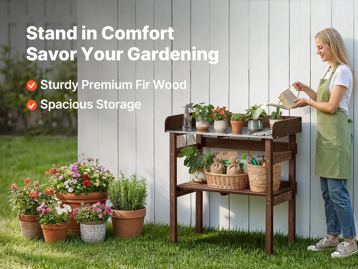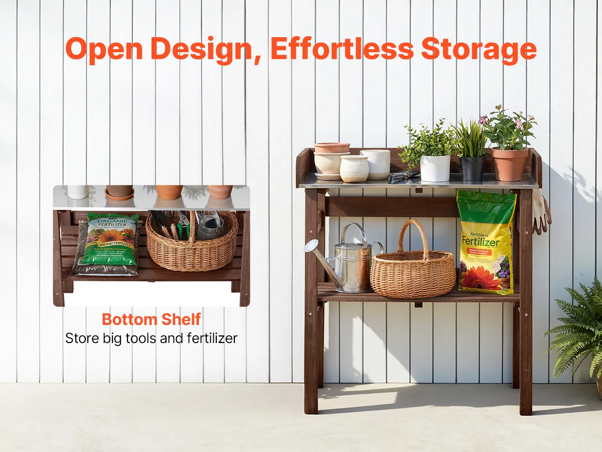 Deze tuintafel heeft een onderste plank voor het opbergen van grotere gereedschappen, meststoffen en andere benodigdheden, zodat deze binnen handbereik zijn.