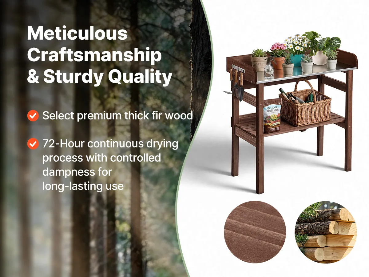 VEVOR Plantentafel, Tuintafel, Werktafel met Groot Houten Blad, Planken & Haken, Bloementafel, Buitentafel voor het oppotten van planten, ideaal voor Terras, Tuin & Balkon, Bruin, 780x380x820 mm