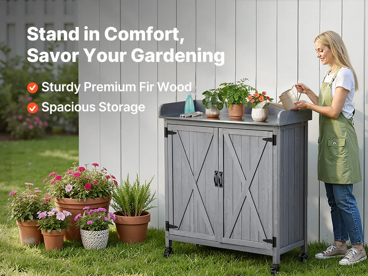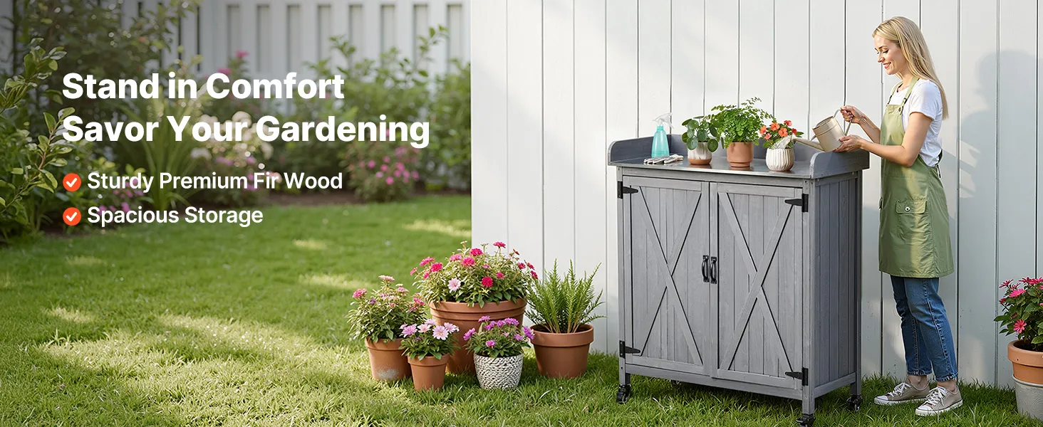Ample Storage Space: Equipped with a cabinet, our potting table holds larger tools and fertilizers, keeping supplies organized and easily accessible