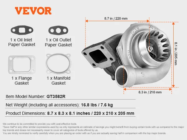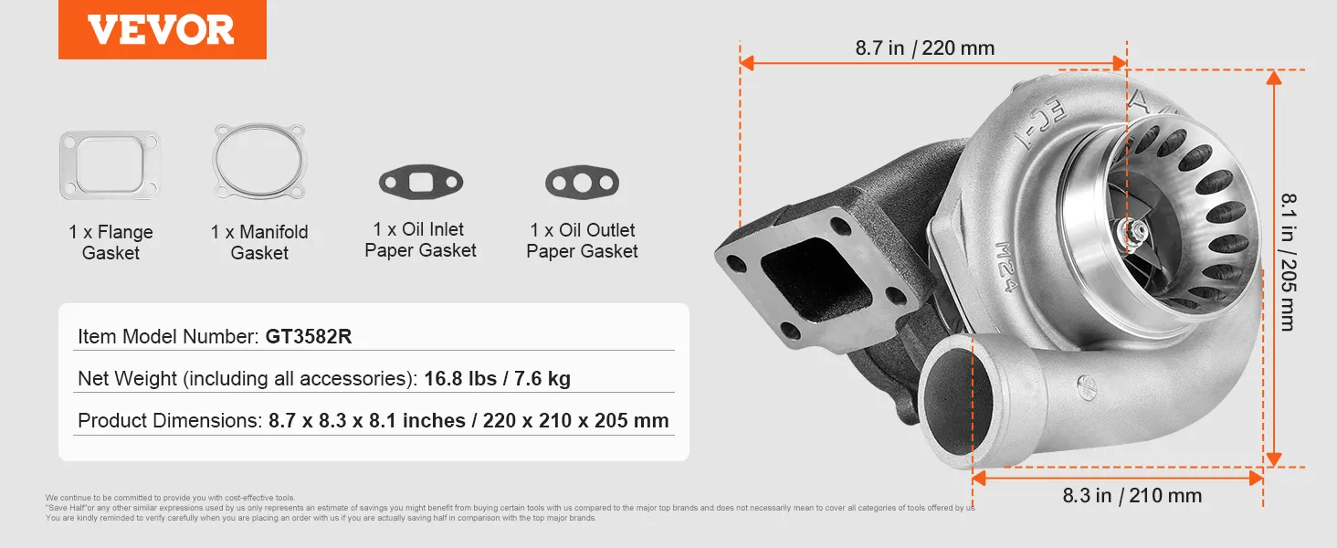 VEVOR Turbocompressor met pakkingset Turbocompressorvervanging voor automotoren Compatibel met 2,5L - 6L motorinhoud, hittebestendige motor Turbocompressor met K418-legering waaier