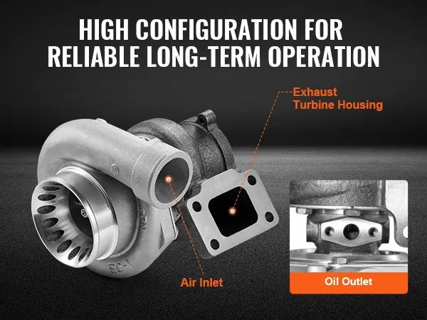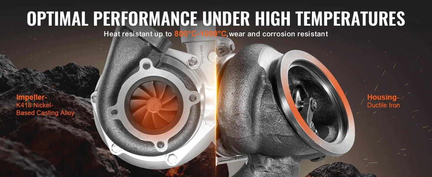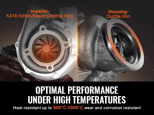 Hittebestendige materialen: De turbocompressor heeft een nodulair gietijzeren behuizing die bestand is tegen temperaturen tot 800-1000°C. Dit zorgt voor betrouwbare prestaties en stabiliteit, zelfs bij extreme temperaturen.