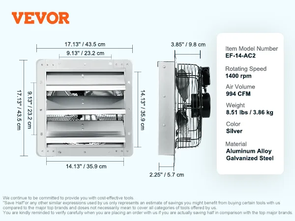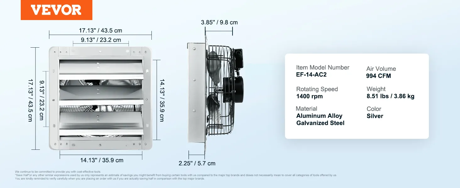 VEVOR Shutter Exhaust Fan, 356 mm High-speed 1400RPM 994 CFM, Aluminum Wall Mount Attic Fan with AC-motor, Ventilation and Cooling for Greenhouses, Garages, Sheds, Shops