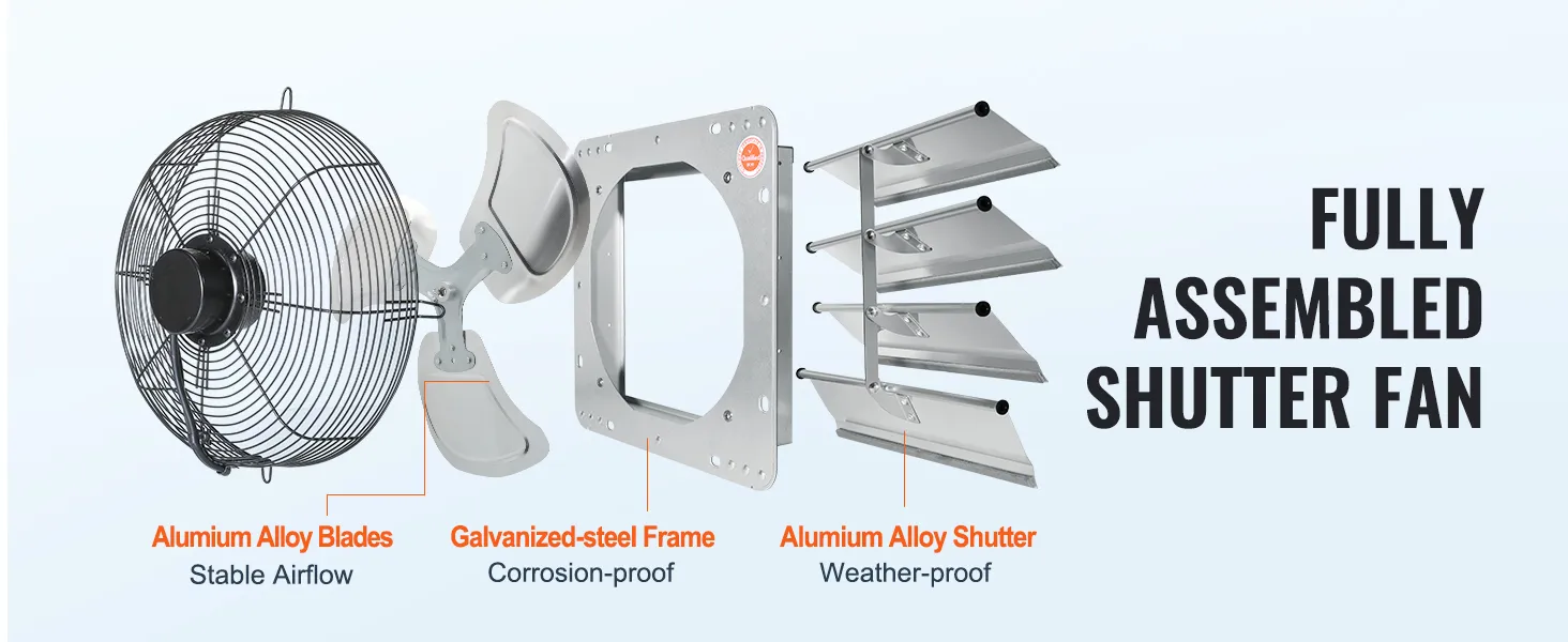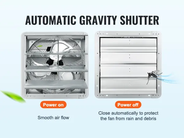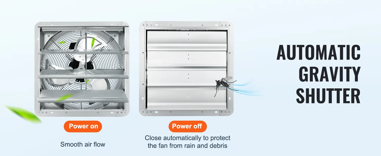 Automatische uitschakeling: De hoogwaardige materialen van de behuizing en het rooster zorgen ervoor dat de ventilator ook bij barre weersomstandigheden zoals regen en sneeuw uitstekend presteert. De lamellenventilator schakelt in de winter automatisch uit wanneer deze niet wordt gebruikt om de binnentemperatuur op peil te houden.