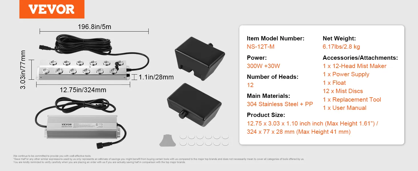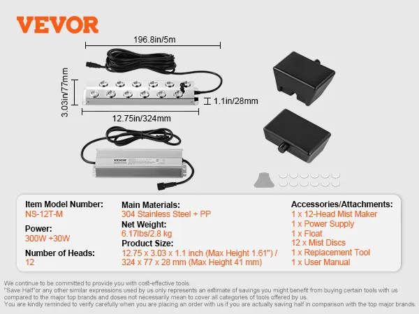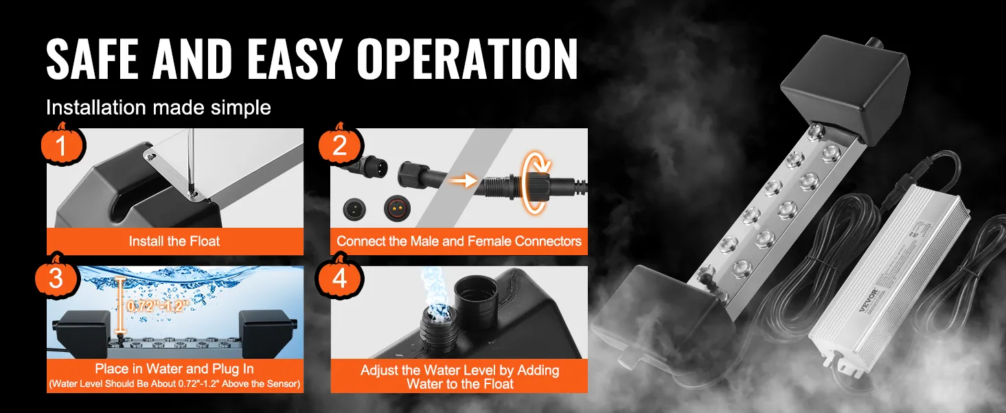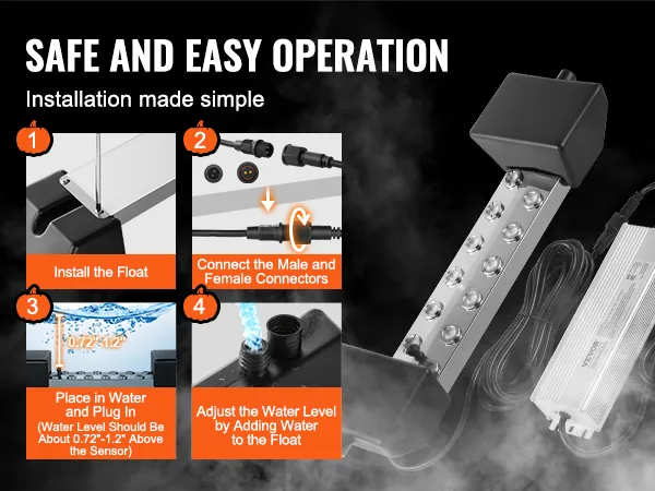 Eenvoudige installatie en onderhoud: installeer de vlotter en plaats de mistgenerator met de voorkant naar boven in het water. Sluit vervolgens het apparaat aan om een grote hoeveelheid nevel te creëren. Het eenvoudig te monteren ontwerp maakt eenvoudige vervanging mogelijk, waardoor onderhoud en reiniging eenvoudiger worden. Defecte mistkoppen kunnen worden vervangen door het onderdeel te draaien. Inclusief 12 extra mistschijven voor toekomstig gebruik.