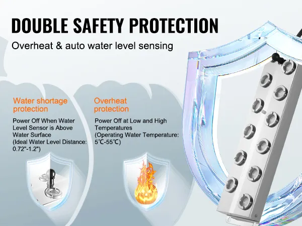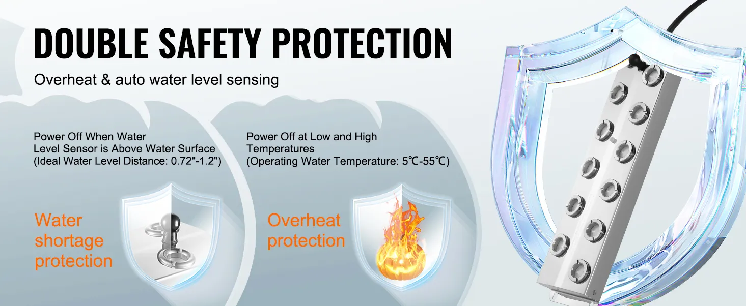 Veilig en betrouwbaar: Het optimale waterniveau voor installatie ligt 2 cm boven de sensor. Wanneer de sensor detecteert dat het waterniveau onder de veiligheidslimiet ligt, wordt de stroomtoevoer automatisch afgesloten. De ultrasone verstuiver heeft ook een watertemperatuursensor die automatisch de stroomtoevoer onderbreekt bij lage of hoge temperaturen (werkwatertemperatuur: 5 ℃ - 55 ℃) om schade veroorzaakt door droge verbranding te voorkomen.