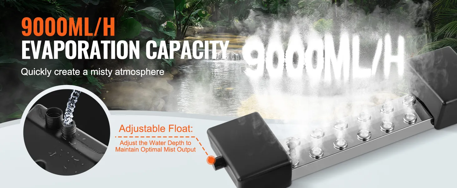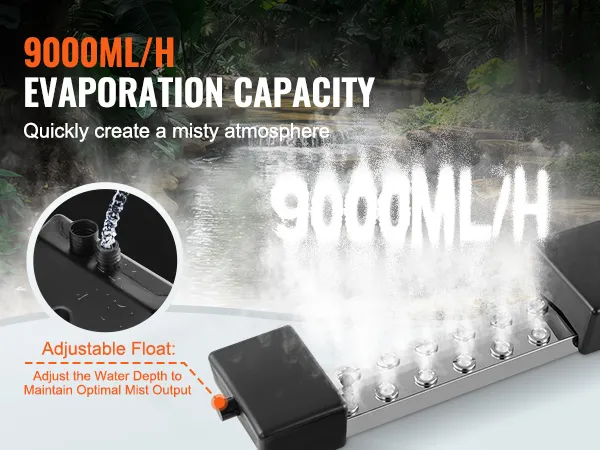 Groot nevelvolume: De ultrasone vernevelaar heeft 12 sproeiers, die elk een nevelvolume van 9000 ml/uur produceren, waardoor snel een mistige atmosfeer ontstaat. De positie van de mistgenerator kan worden aangepast met de drijvende boei door water toe te voegen om een optimale waterdiepte te bereiken die geschikt is voor verschillende waterdrukken en omgevingen.