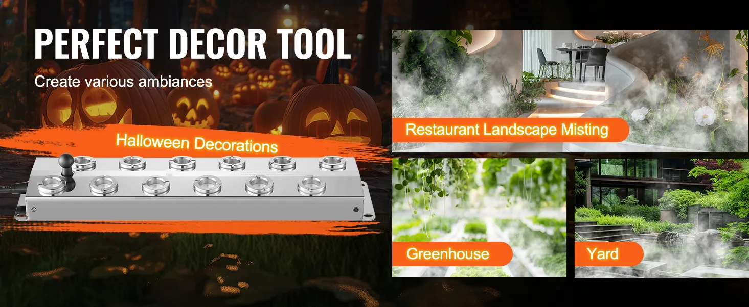 Onze vijververnevelaar is ideaal voor tuinverfraaiing, kasoptimalisatie en het besproeien van restaurantlandschappen, maar is ook ideaal voor het creëren van een feestelijke sfeer voor Halloween en andere feestdagen.