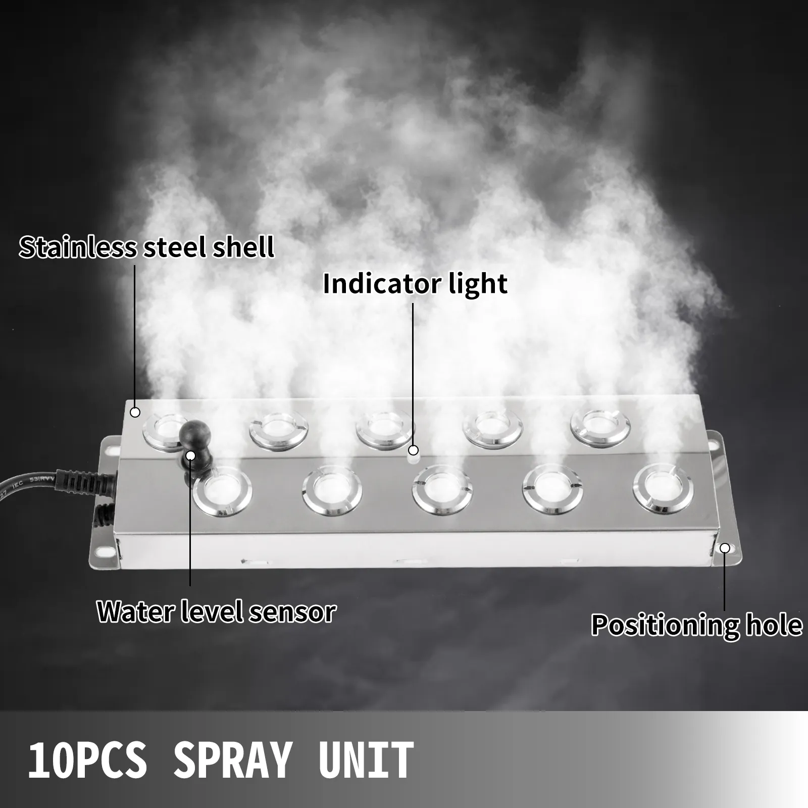 De vijververnevelaar is gemaakt van een goede mechanische sterkte van roestvrijstalen omhulsel, ontworpen met een 10-delige spuiteenheid om een enorme hoeveelheid mist te creëren.
