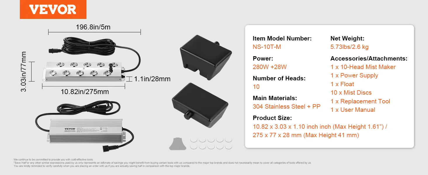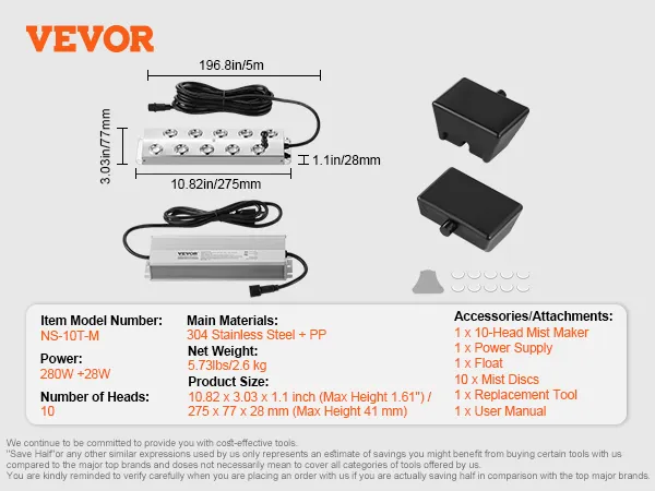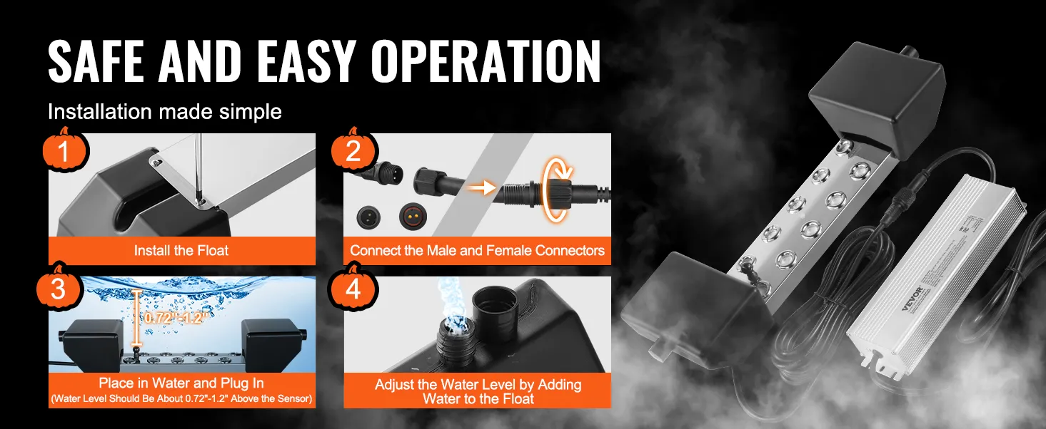 Eenvoudige installatie en onderhoud: installeer de vlotter en plaats de mistgenerator met de voorkant naar boven in het water. Sluit vervolgens het apparaat aan om een grote hoeveelheid mist te creëren. Het eenvoudig te monteren ontwerp maakt eenvoudige vervanging mogelijk, waardoor onderhoud en reiniging eenvoudiger worden. Defecte mistkoppen kunnen worden vervangen door het onderdeel te draaien. Inclusief 10 extra mistschijven voor toekomstig gebruik.