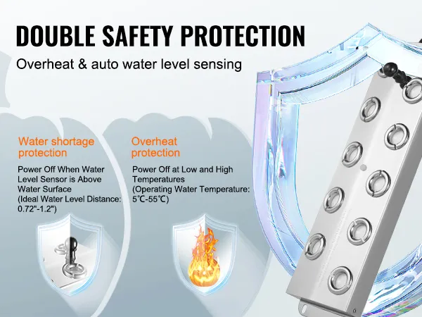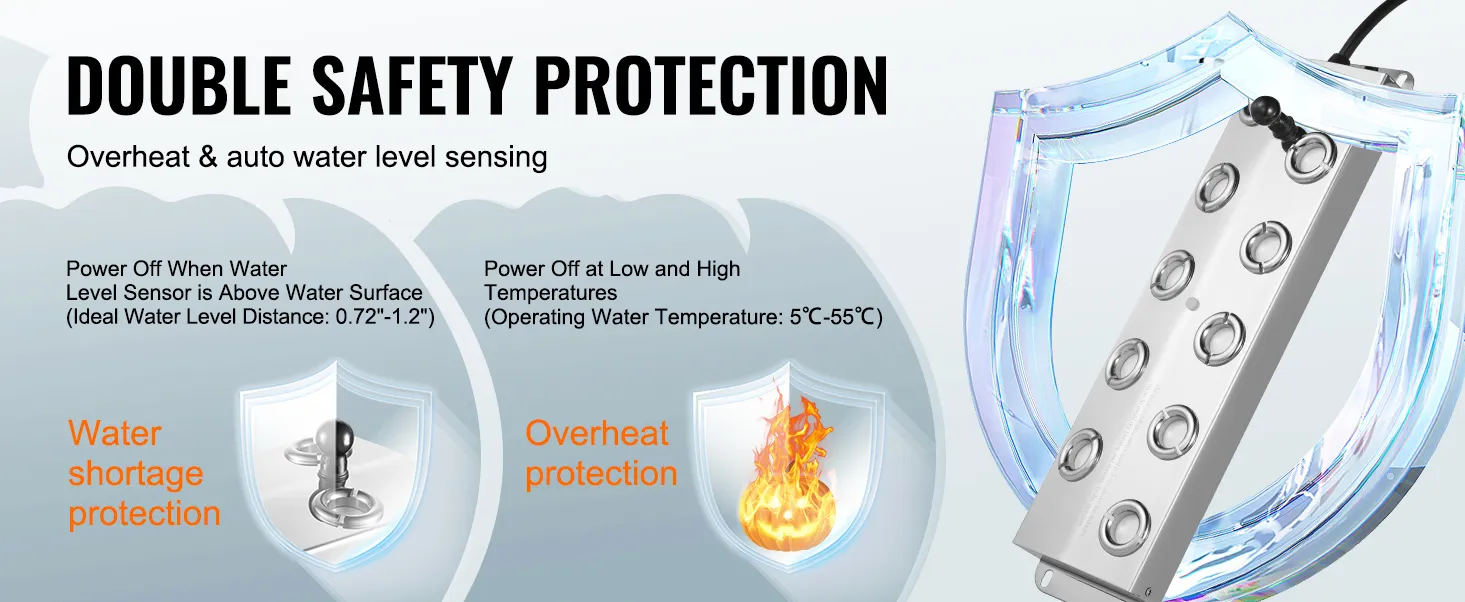 Veilig en betrouwbaar: Het optimale waterniveau voor installatie ligt 2 cm boven de sensor. Wanneer de sensor detecteert dat het waterniveau onder de veiligheidslimiet ligt, wordt de stroomtoevoer automatisch afgesloten. De ultrasone verstuiver heeft ook een watertemperatuursensor die automatisch de stroomtoevoer onderbreekt bij lage of hoge temperaturen (werkwatertemperatuur: 5℃ - 55℃) om schade veroorzaakt door droge verbranding te voorkomen.