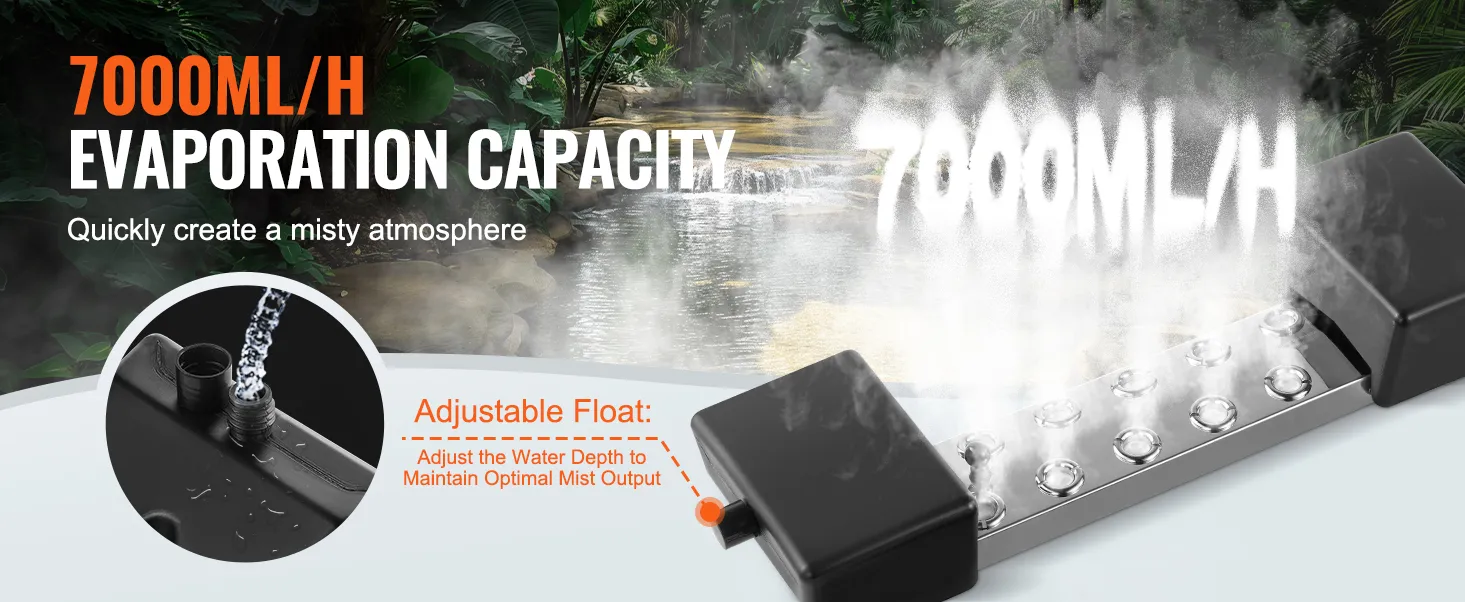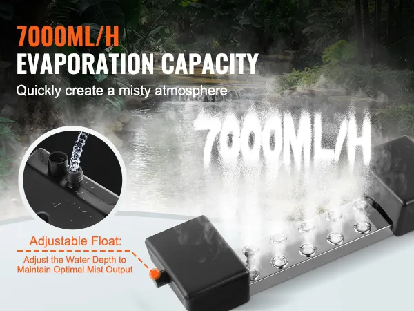 Groot mistvolume: de ultrasone vernevelaar heeft 10 koppen die een spray van 7000 ml/u produceren en snel een magische sfeer creëren. De positie van de mistmaker kan met de drijvende boei worden aangepast door water toe te voegen om een optimale waterdiepte te bereiken die geschikt is voor verschillende waterdrukken en omgevingen.