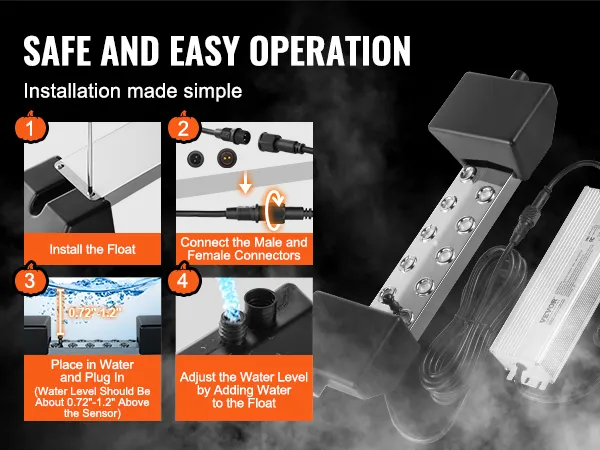 De ultrasone vijververnevelaar is eenvoudig te installeren in een duidelijk 4-stappenproces. Plaats de mistgenerator eenvoudigweg met de voorkant naar boven in het water, sluit hem aan en hij produceert een grote hoeveelheid mist, waardoor u kostbare tijd en moeite bespaart.