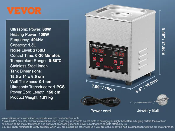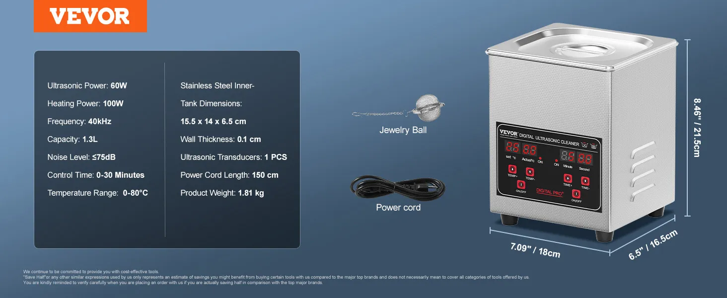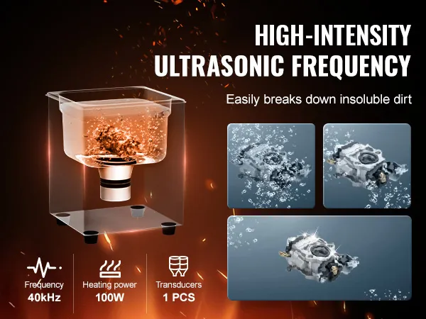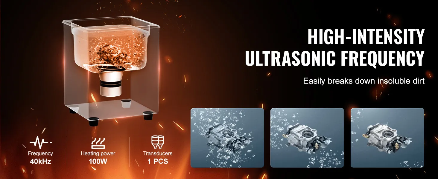 Powerful Cleaning Performance: The VEVOR Ultrasonic Cleaner operates at an ultra-high frequency of 40kHz, generating millions of tiny bubbles that explode in water, releasing strong cleaning energy. This energy penetrates every crevice, thoroughly removing stubborn stains from delicate parts, ensuring no area is left uncleaned.