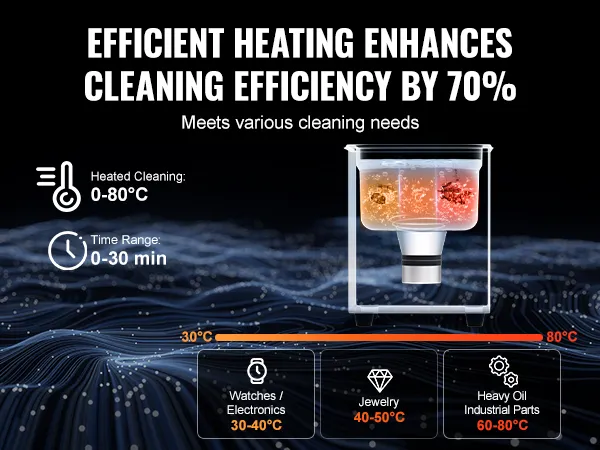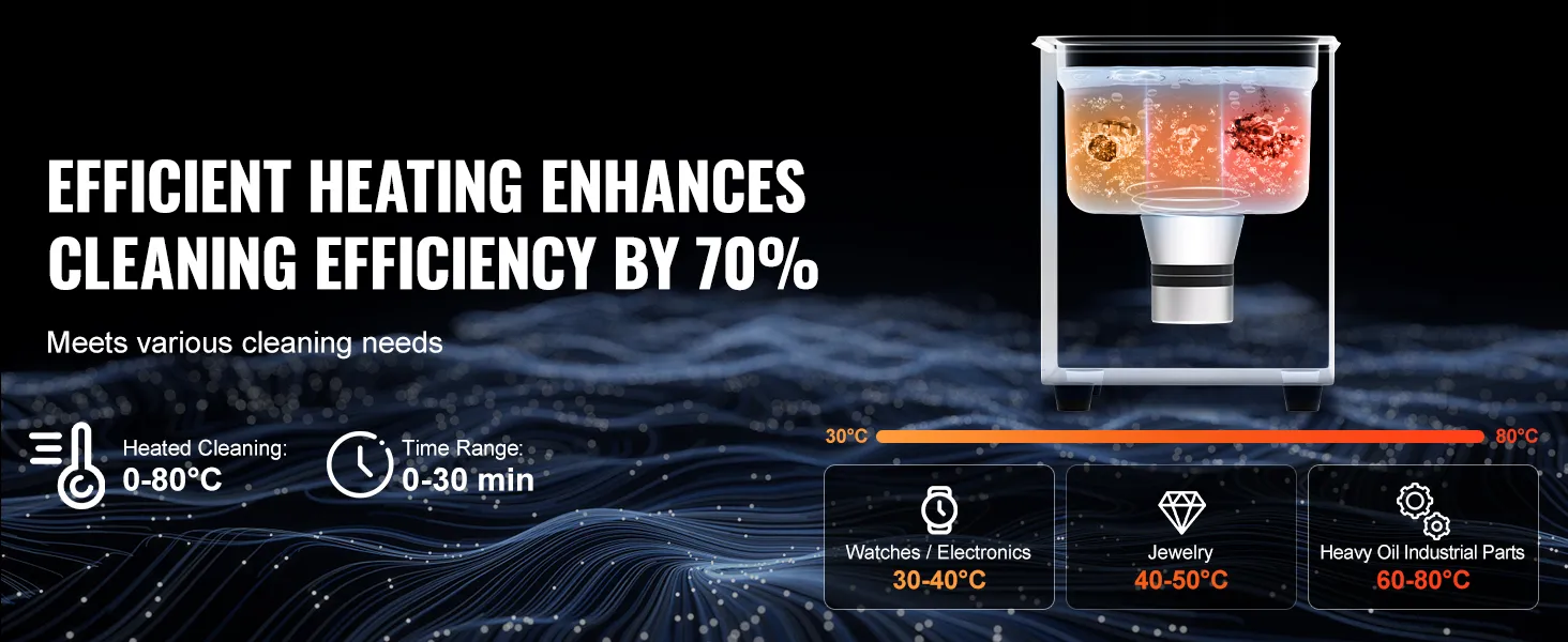 Heated Cleaning: For different items like jewelry, watches/electronic accessories, and heavy grease industrial components, you can control the cleaning temperature from 0-80°C to accelerate the dissolution of dirt. This provides more efficient and targeted cleaning results. The high-temperature mode quickly breaks down stubborn grease, while the low-temperature mode gently protects sensitive materials.