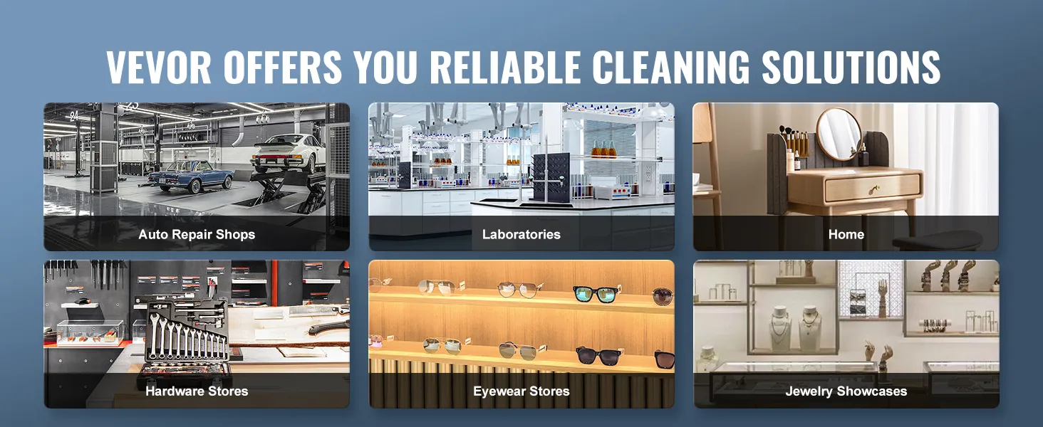This cleaner machine is suitable not only for commercial use but also widely applicable in laboratories, carburetors, circuit boards, dental equipment, jewelry, eyeglasses, watches, tableware, and more.