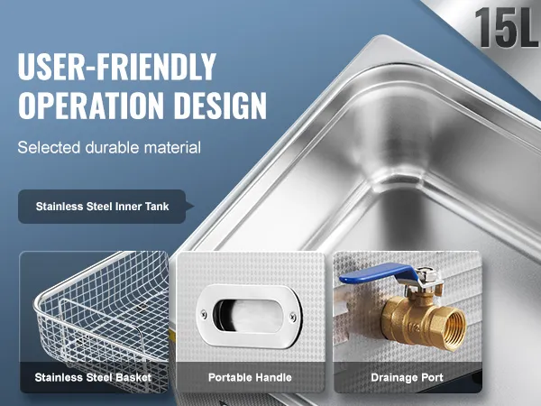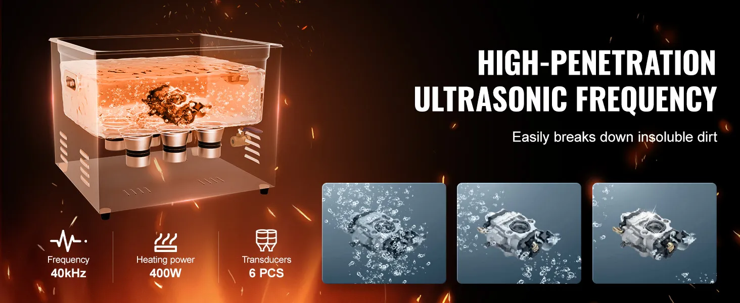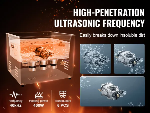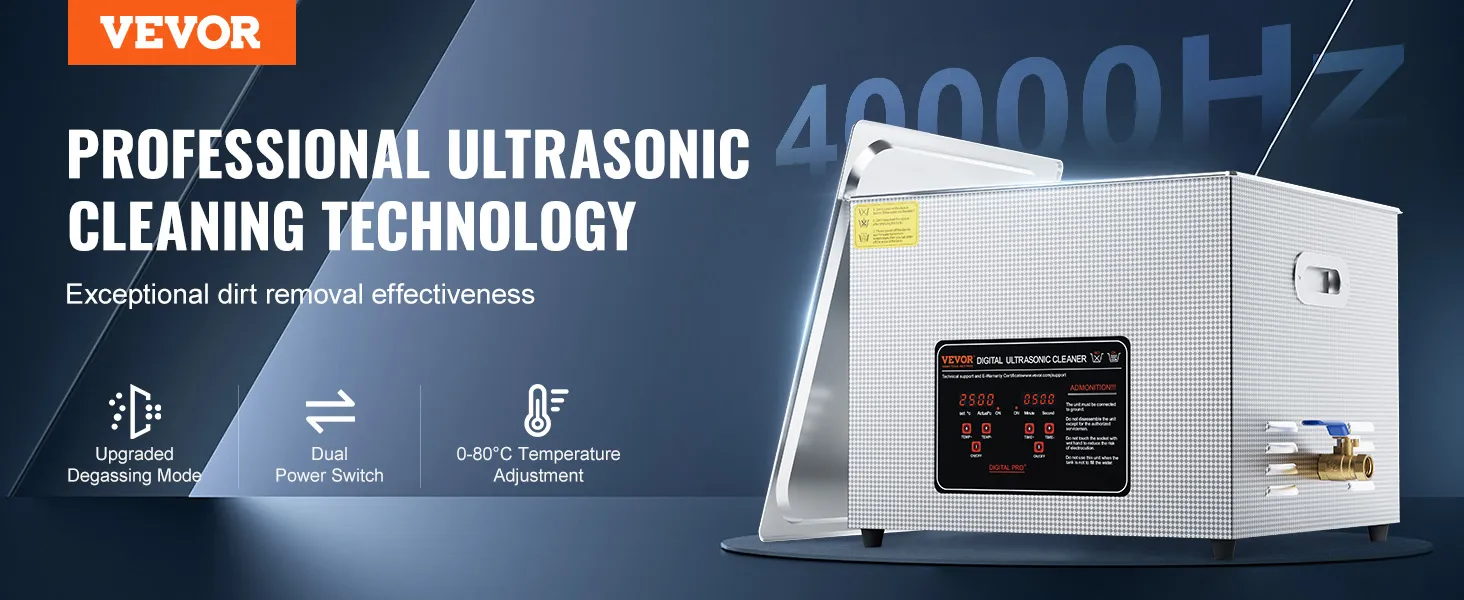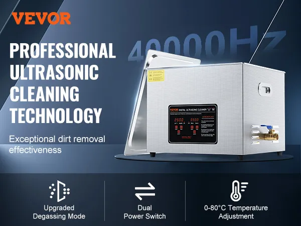 Sterke reinigingsprestaties: de VEVOR ultrasone reiniger werkt op een ultrahoge frequentie van 40 kHz en produceert miljoenen kleine belletjes die in het water exploderen en krachtige reinigingsenergie vrijgeven. Deze energie dringt door in elke scheur en verwijdert zelfs hardnekkig vuil van gevoelige onderdelen zo grondig dat geen enkel gebied onrein blijft.