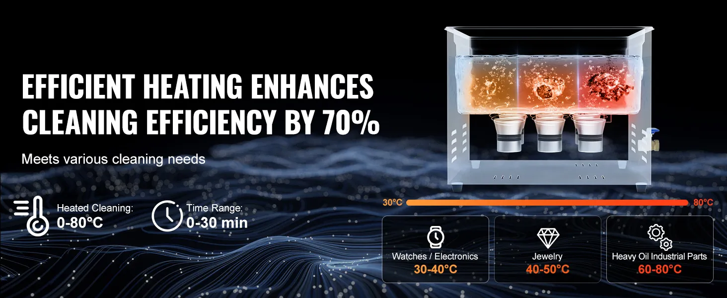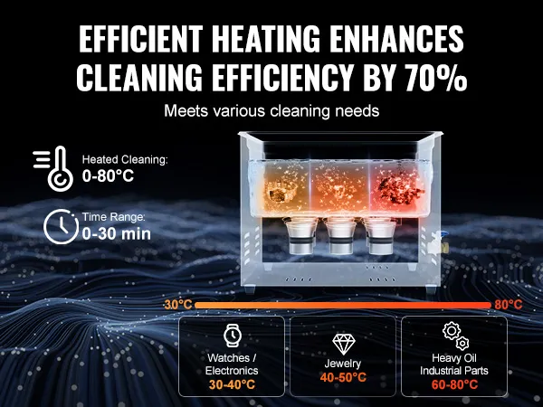 Reinigen met warmte: Voor diverse artikelen zoals sieraden, horloges/elektronische accessoires en sterk vettige industriële onderdelen kunt u de reinigingstemperatuur instellen van 0 tot 80°C om de vuilafgifte te versnellen. Het resultaat is een efficiëntere en doelgerichtere reiniging. De hoge temperatuurmodus verwijdert snel hardnekkig vuil, terwijl de lage temperatuurmodus zacht is voor gevoelige materialen.