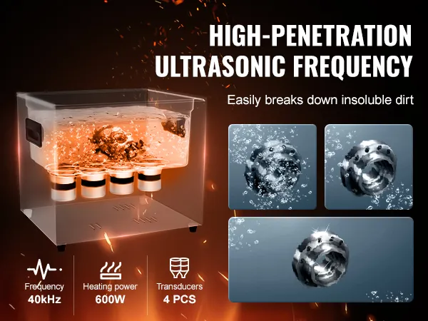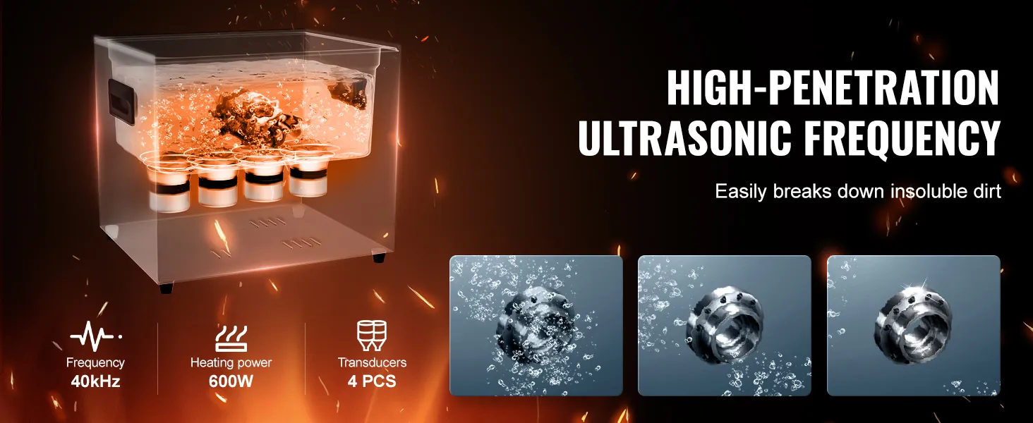 Powerful Cleaning Performance: The VEVOR Ultrasonic Cleaner operates at an ultra-high frequency of 40kHz, generating millions of tiny bubbles that explode in water, releasing strong cleaning energy. This energy penetrates every crevice, thoroughly removing stubborn stains from delicate parts, ensuring no area is left uncleaned.