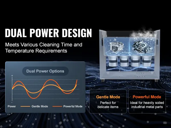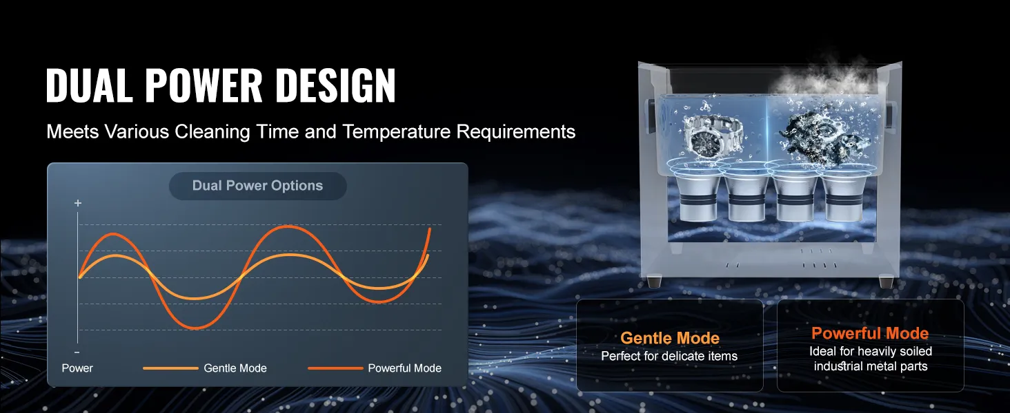 Dual-Power Degassing Mode: The degassing mode effectively removes air from the liquid, enhancing working efficiency by 30% and achieving zero-angle precision cleaning of internal holes and crevices. With dual power options, cleaner machine caters to both delicate items and heavy-duty industrial products, making cleaning more targeted without causing damage.