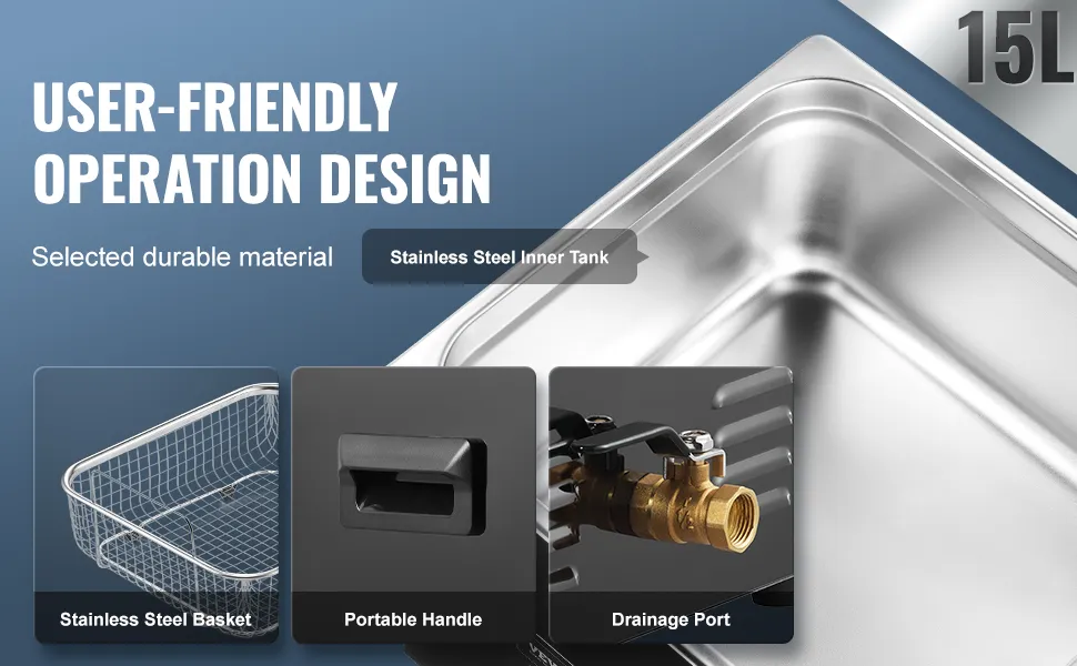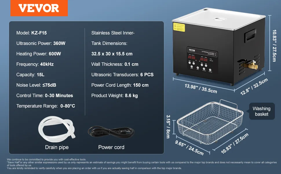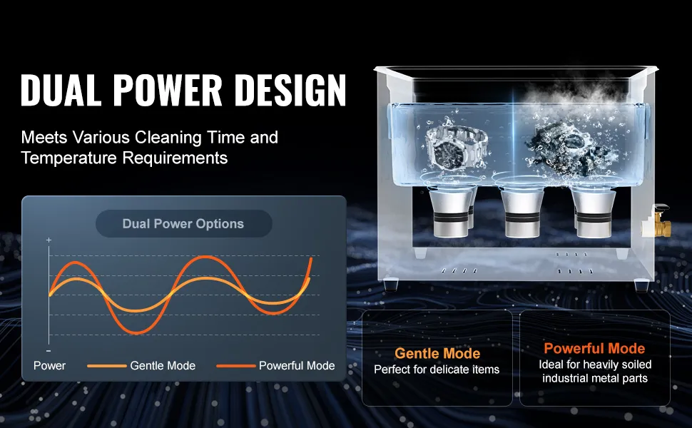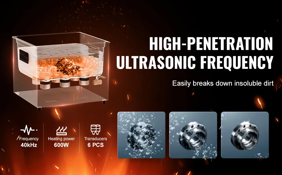 Sterke reinigingsprestaties: de VEVOR ultrasone reiniger werkt op een ultrahoge frequentie van 40 kHz en produceert miljoenen kleine belletjes die in het water exploderen en krachtige reinigingsenergie vrijgeven. Deze energie dringt door in elke scheur en verwijdert zelfs hardnekkig vuil van gevoelige onderdelen zo grondig dat geen enkel gebied onrein blijft.