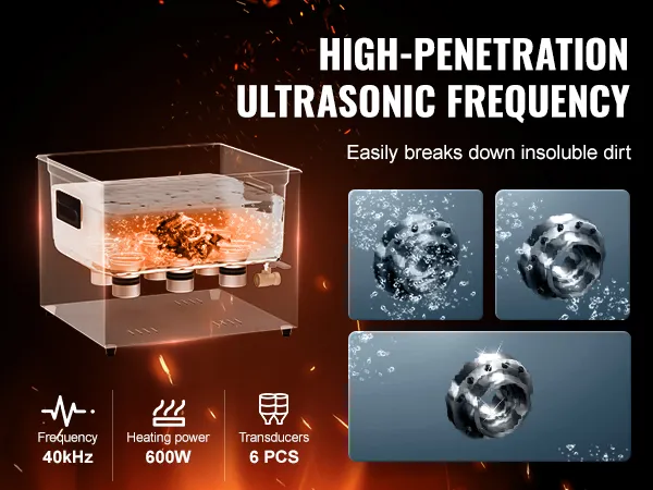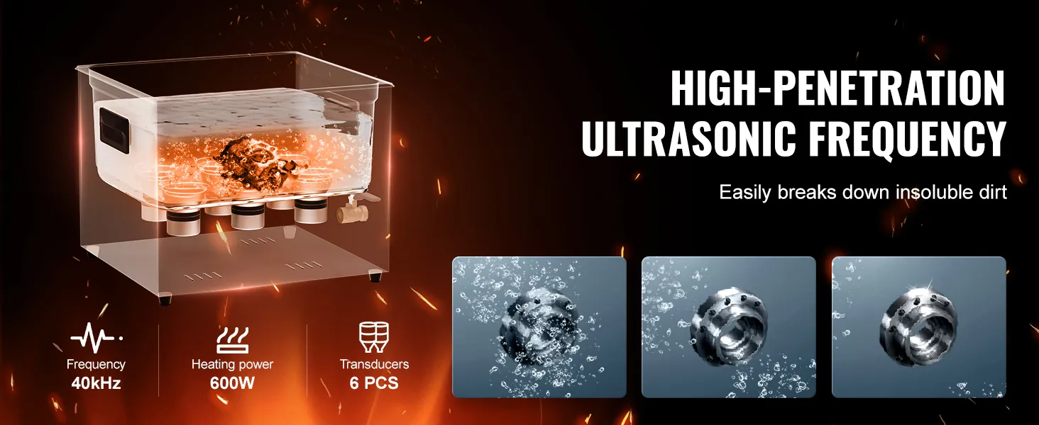 Powerful Cleaning Performance: The VEVOR Ultrasonic Cleaner operates at an ultra-high frequency of 40kHz, generating millions of tiny bubbles that explode in water, releasing strong cleaning energy. This energy penetrates every crevice, thoroughly removing stubborn stains from delicate parts, ensuring no area is left uncleaned.