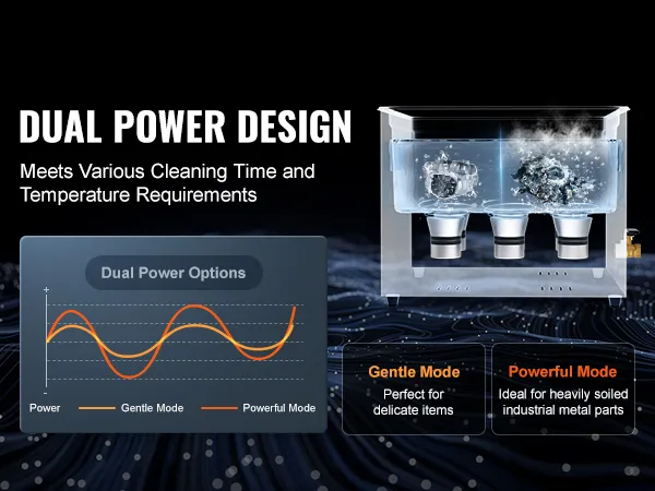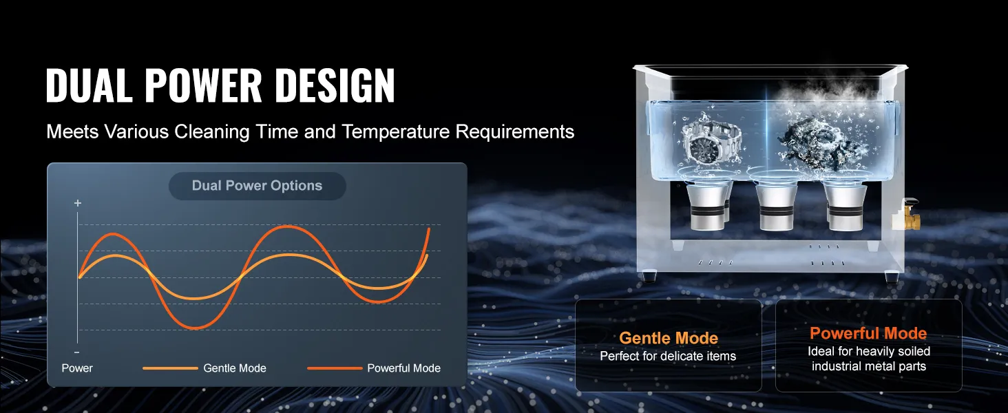 Dual-Power Degassing Mode: The degassing mode effectively removes air from the liquid, enhancing working efficiency by 30% and achieving zero-angle precision cleaning of internal holes and crevices. With dual power options, cleaner machine caters to both delicate items and heavy-duty industrial products, making cleaning more targeted without causing damage.