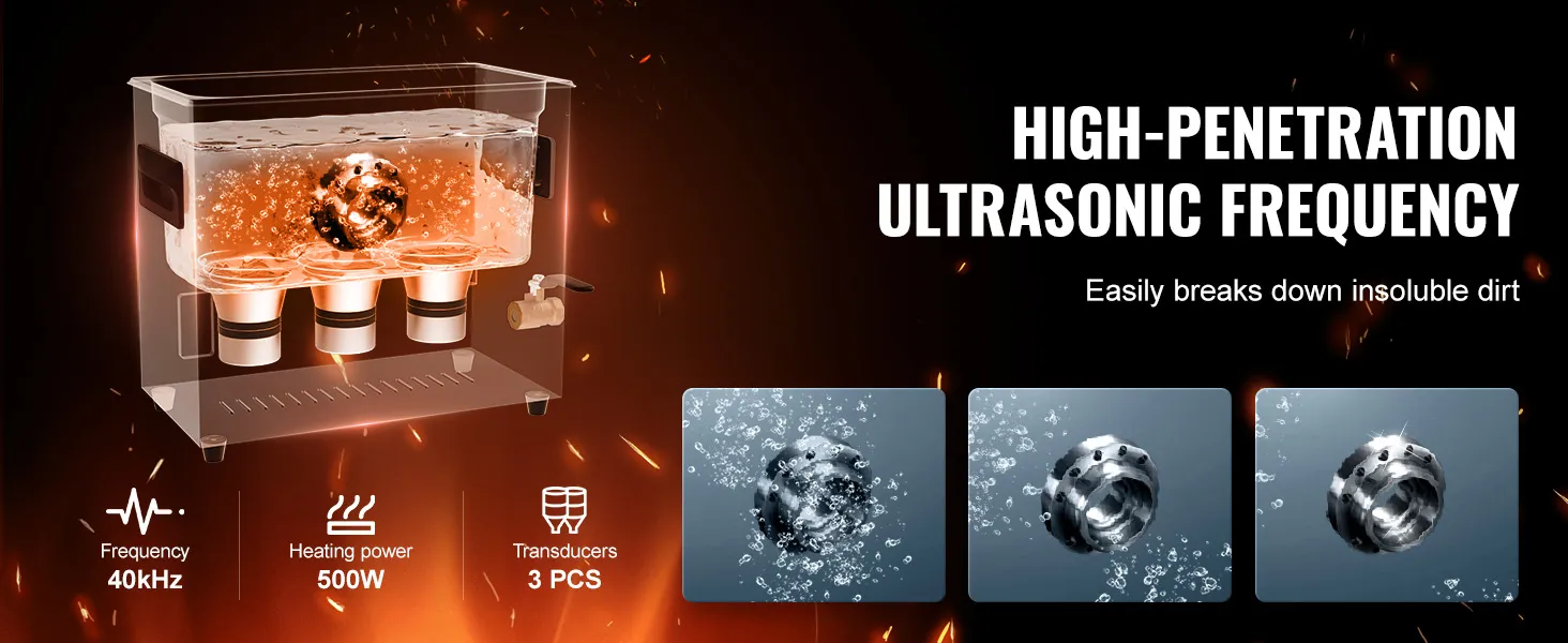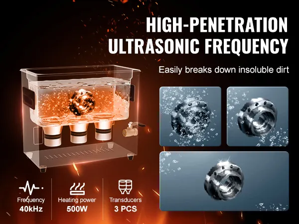 Powerful Cleaning Performance: The VEVOR Ultrasonic Cleaner operates at an ultra-high frequency of 40kHz, generating millions of tiny bubbles that explode in water, releasing strong cleaning energy. This energy penetrates every crevice, thoroughly removing stubborn stains from delicate parts, ensuring no area is left uncleaned.