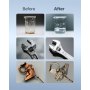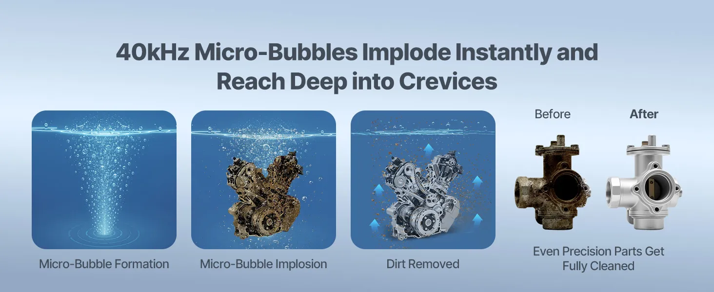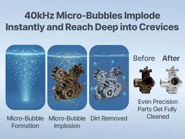 Krachtige reiniging: ultrasone golven van 40 kHz genereren microbellen die snel en grondig olie en deeltjes losmaken van moeilijk bereikbare plaatsen zoals carburateurs, sproeiers en kleine onderdelen. Gebruik voor optimale resultaten een neutraal reinigingsmiddel en warm water.