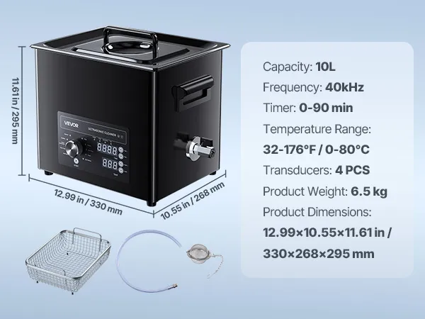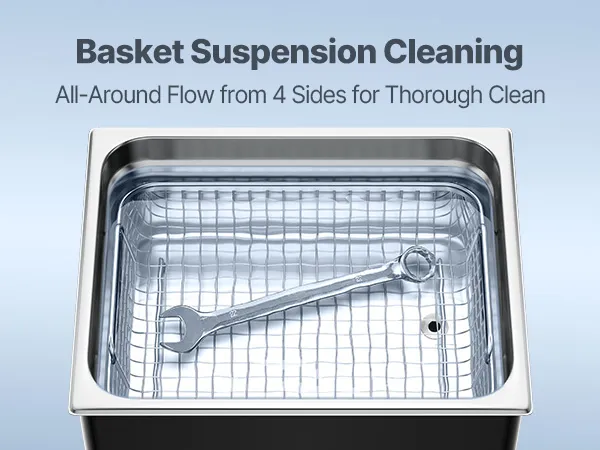 Veelzijdig gebruik: onze ultrasone reiniger met draaiknop reinigt een breed scala aan materialen, van metalen tot precisie-instrumenten. Dankzij de instelbare parameters bereikt u optimale resultaten voor verschillende items. De ophanging van de korf zorgt voor een gelijkmatige reiniging en beschermt het waterreservoir.