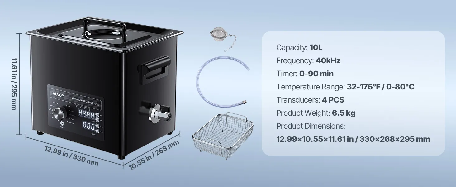 VEVOR ultrasone reiniger, professioneel ultrasoon reinigingsapparaat met draaiknopbediening, 10 liter inhoud, reinigingsapparaat met mandje en reinigingsbal, ultrasone reiniger voor horloges, scheermesjes, sieraden en munten.