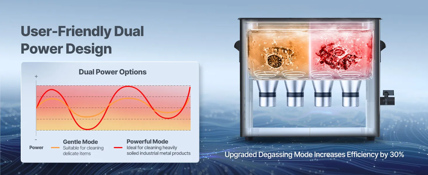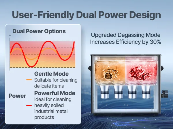 Twee vermogensstanden: De ontgassingsstand van deze ultrasone reiniger verwijdert lucht uit vloeistoffen, waardoor de efficiëntie met 30% toeneemt. Twee vermogensniveaus maken een nauwkeurige en voorzichtige reiniging van delicate voorwerpen of robuuste onderdelen mogelijk.
